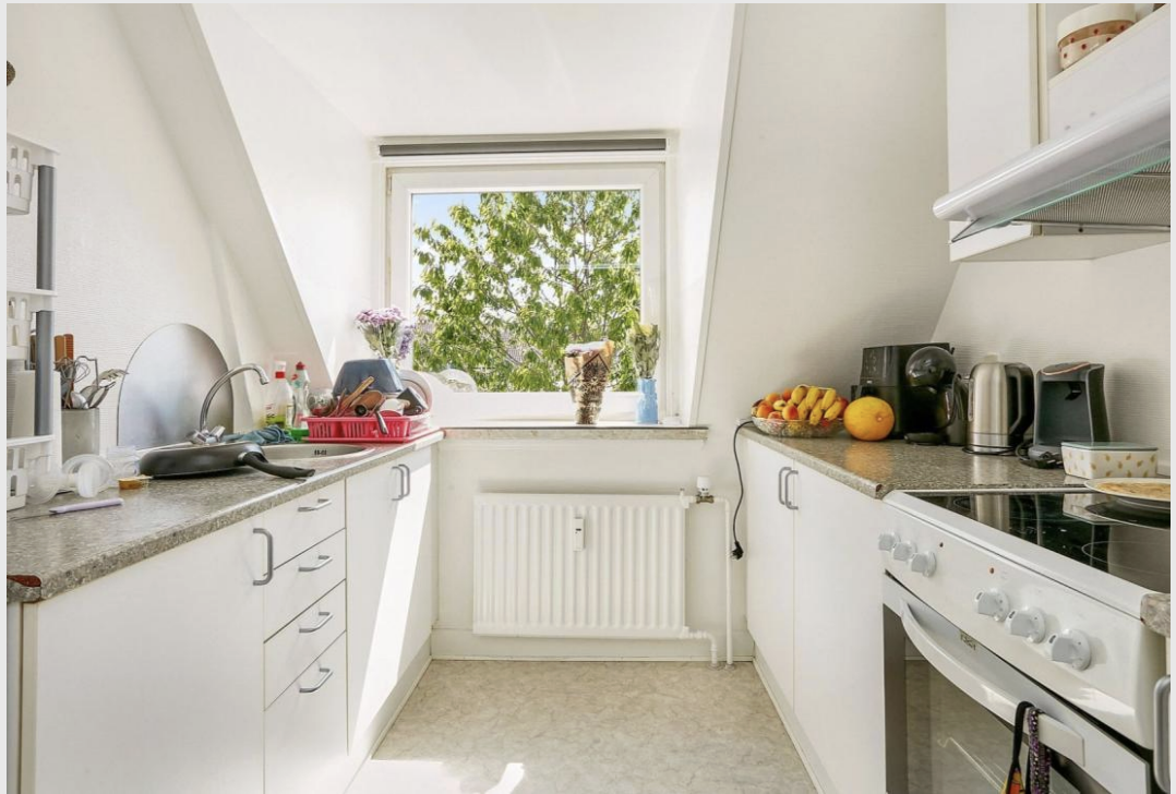 Køkken og stue Denne lyse lejlighed fungerer opføres med et åbent køkken-alrum, hvor køkkenet smelter sammen med stuen. Køkkenet er designet med lyse og elegante materialer og inkluderer nødvendige hårde hvidevarer. Soveværelse Lejlighedens lyse soveværelse er beliggende i den ene ende af boligen og indeholder hele tre fastmonterede garderobeskabe. Dertil er der fin plads til en dobbeltseng. Badeværelse Lejlighedens lyse badeværelse har en stilfuld og enkel indretning og indeholder bruseniche, toilet, håndvask og opbevaringsskab. Badeværelset er også udstyret med en vaskesøjle, der inkluderer vaskemaskine og tørretumbler. Altan/Terrasse Fra stuen er der direkte adgang til en egen terrasse/altan, hvor du kan nyde frisk luft og udendørs øjeblikke. Billederne er fra en tilsvarende bolig.
