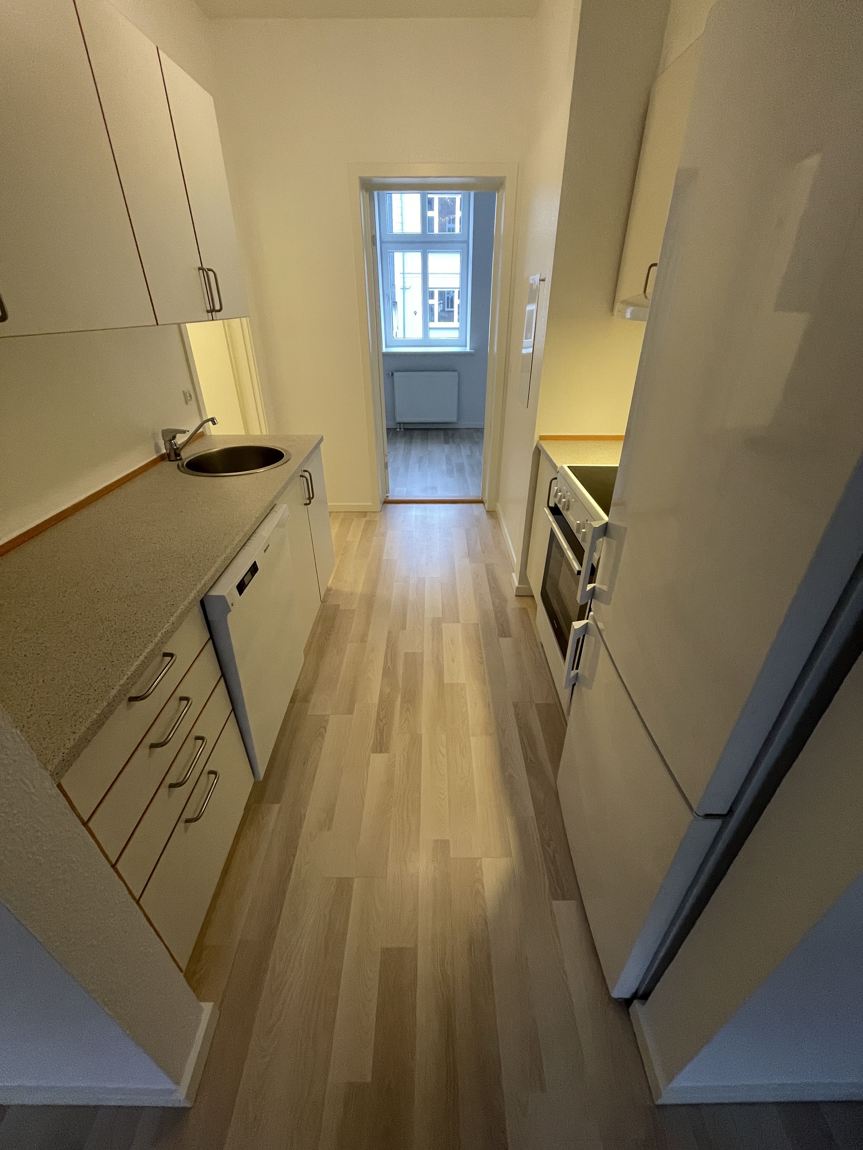 Lejligheden er på 48 kvm. men er utrolig godt indrettet, med mulighed for deling mellem f.eks. 2 studerende på et stramt budget. Den har en indgang kombineret med køkken alrum, der også virker som fordeling til 2 gode rektangulære værelser og et badeværelse. Vaskemaskine og tørretumbler forefindes i haven og kan benyttes i lejeperioden uden meromkostning (udover el-forbrug).