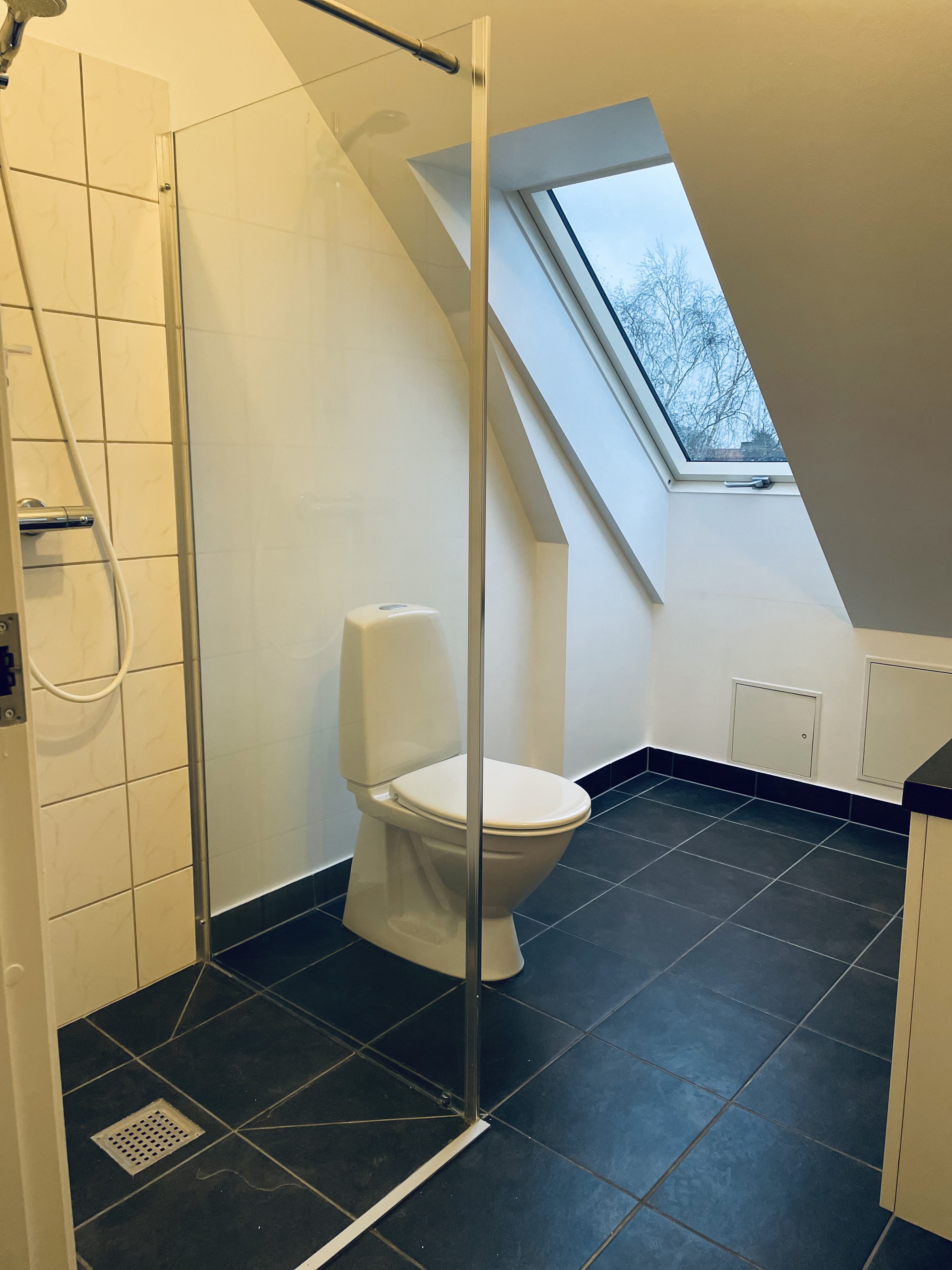 Stort og rummeligt badeværelse med skabsarrangement