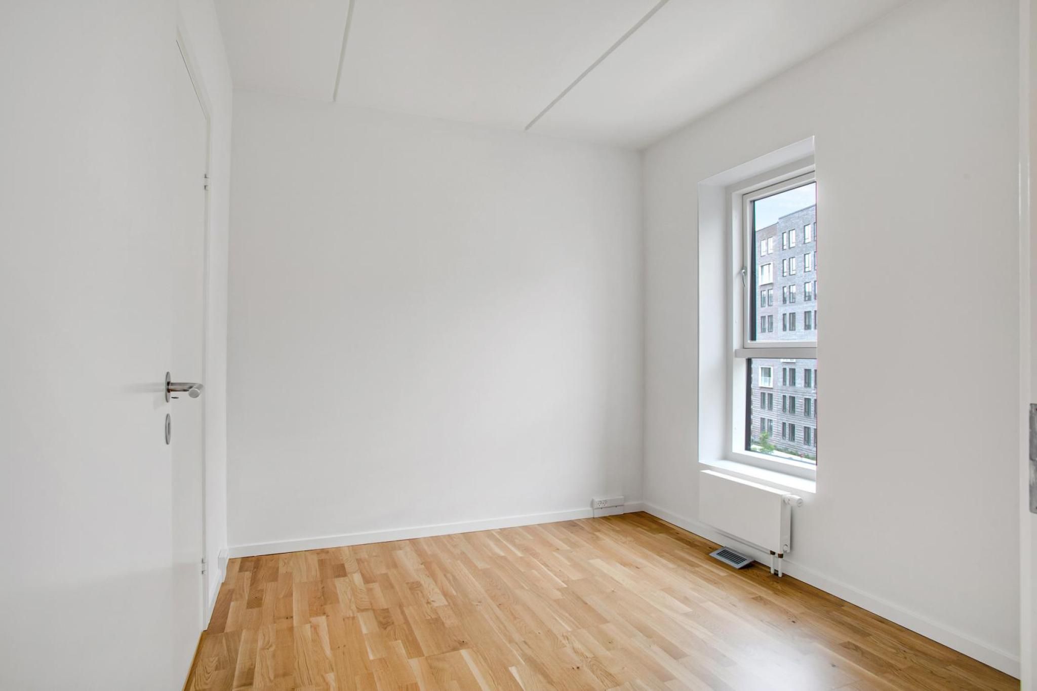 De to soveværelser er næsten lige store, og de er begge lyse og med indbyggede skabe. Badeværelset er også moderne og fremstår med både vaskemaskine og tørretumbler.