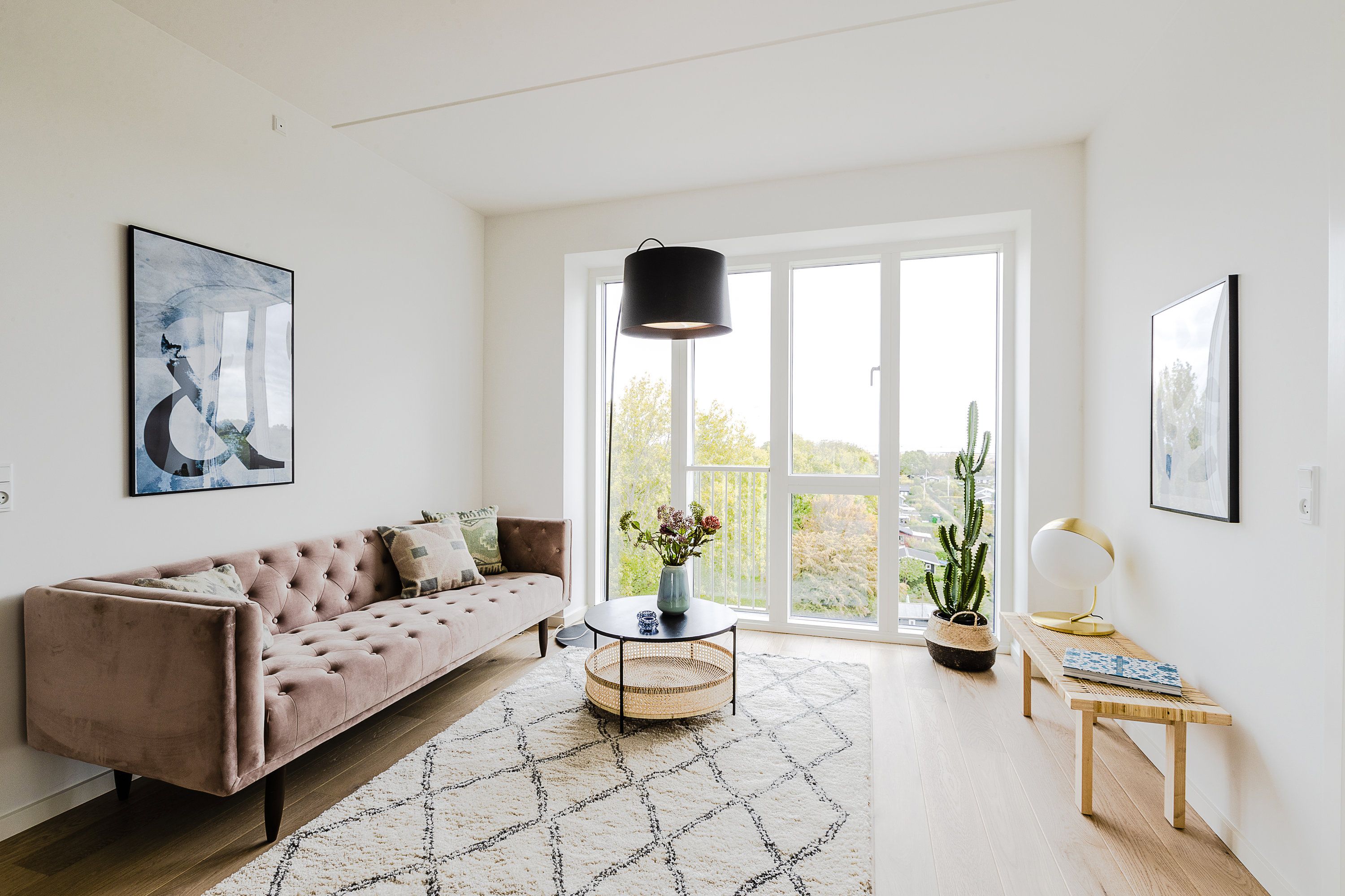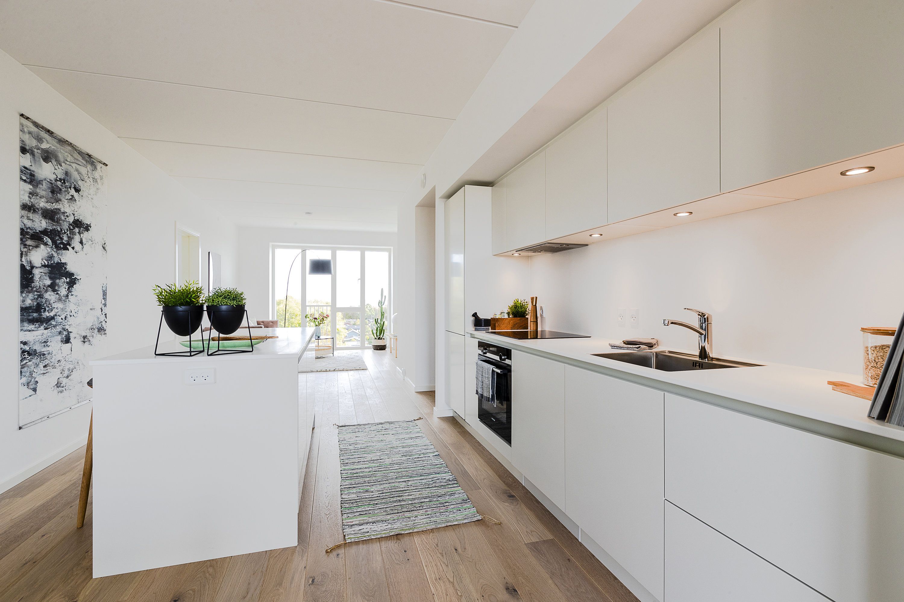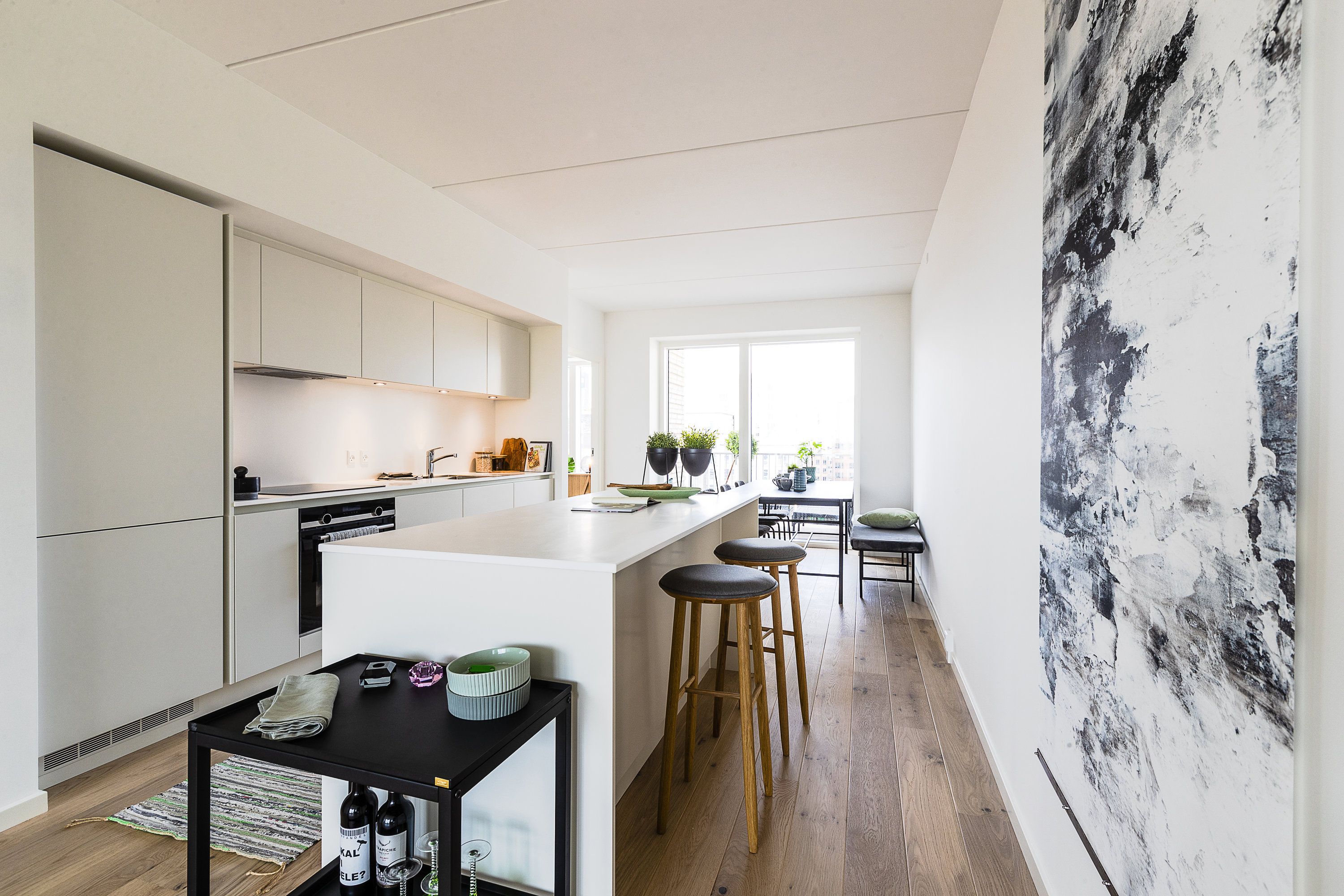 Lejligheden indeholder: Entré, der leder videre til et smukt og lyst køkken/alrum med alle hårde hvidevarer, stilren kogeø og en elegant buet karnap, som giver et fantastisk lysindfald. Køkken/alrummet er integreret med lejlighedens stue og skaber et åbent og indbydende opholdsrum. Lejligheden rummer to lyse og indretningsvenlige værelser med indbyggede skabe. Badeværelset er flot renoveret med separat bruseniche og samt både vaskemaskine og tørretumbler.