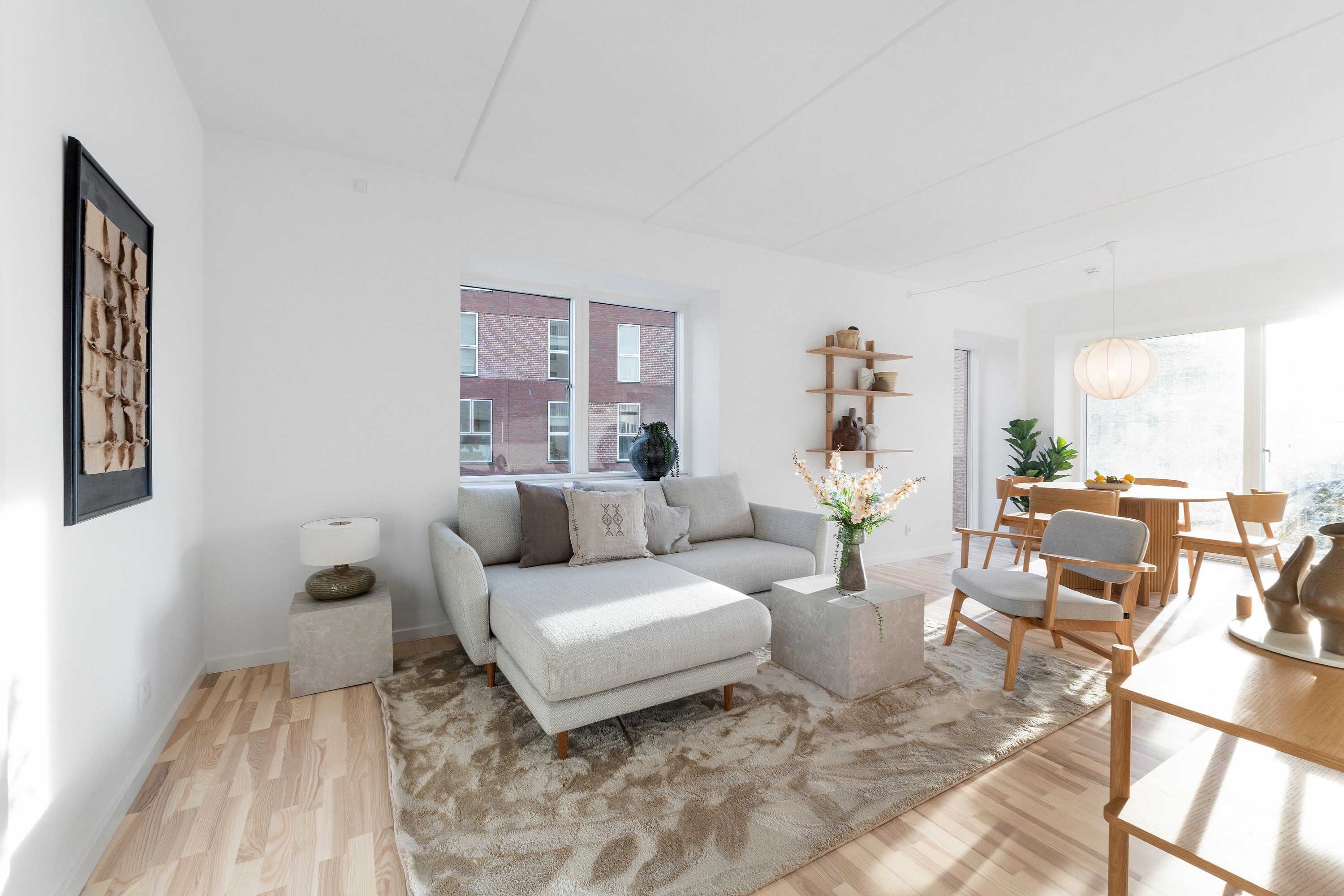 Postbyens markante silhuet med sine fire runde tårne er allerede blevet et nyt vartegn for den centrale del af København. I to af tårnene indrettes der 160 moderne lejeboliger, som nu udbydes til udlejning med indflytning i februar 2026. Lejlighederne varierer i størrelse fra to til syv værelser og er alle udstyret med altan med udsigt til byens liv og Postbyens grønne oaser. I Postbyen bor du i et helt nyt levende bykvarter med hoteller, butikker, restauranter, caféer, og meget mere. Dit nye hjem ligger omgivet af smuk arkitektur, og nedenfor din hoveddør ligger byparken, der grønt og frodigt snor sig gennem Postbyen. Uanset om du lejer en 2-værelses eller en 7-værelses bolig i Postbyen, kommer du til at leve i et unikt og utraditionelt hjem, der byder på alt andet end kvadratiske rum. De cirkelrunde boligtårne skaber nemlig vinkler, snit og hjørner, hvor man hver dag kan glædes over at bo i et hjem, hvor vægge, gulve og lofter ikke følger den traditionelle vinkeltrekant. Træd ind i et hjem, hvor æstetik og funktionalitet går hånd i hånd. Alle lejligheder i Postbyen er gennemtænkt ned til mindste detalje med materialer, der emmer af varme og elegance. De lyse lamelplankegulve i natureg med gulvvarme løber i et ubrudt flow gennem rummene og binder boligen harmonisk sammen. Med lofter og søjler i beton opstår der en spændende og rå kontrast mellem det varme træ og den karakteristiske betonstruktur og tilfører boligen kant og karakter. Køkkenalrummet har direkte adgang til altanen, hvor dagslyset strømmer ind. Her møder strømlinet design fra Invita og corianbordplader de nyeste hårde hvidevarer i høj kvalitet. Det enkle design skaber en rolig og stilfuld ramme, hvor udsigten får lov at stjæle opmærksomheden. Badeværelserne viderefører den enkle og eksklusive stil med smukke grå fliser, væghængte toiletter og en atmosfære af diskret luksus. Som en gennemtænkt detalje er alle indvendige døre udført som indbyggede skydedøre, der både er pladsbesparende og giver et enkelt udtryk mellem rummenes indbyrdes forhold. Øverst oppe i det lave boligtårn er der skabt rum for et imponerende fællesrum, hvor du som lejer kan booke dig ind til at afholde arrangementer, fødselsdage eller barnedåben. Det er ligeledes muligt at leje parkeringsplads i kælderen og til alle boligerne medfølger der depotrum. Bemærk at billederne nødvendigvis ikke stammer fra den konkrete bolig, men kan være fra andre lejligheder i komplekset.