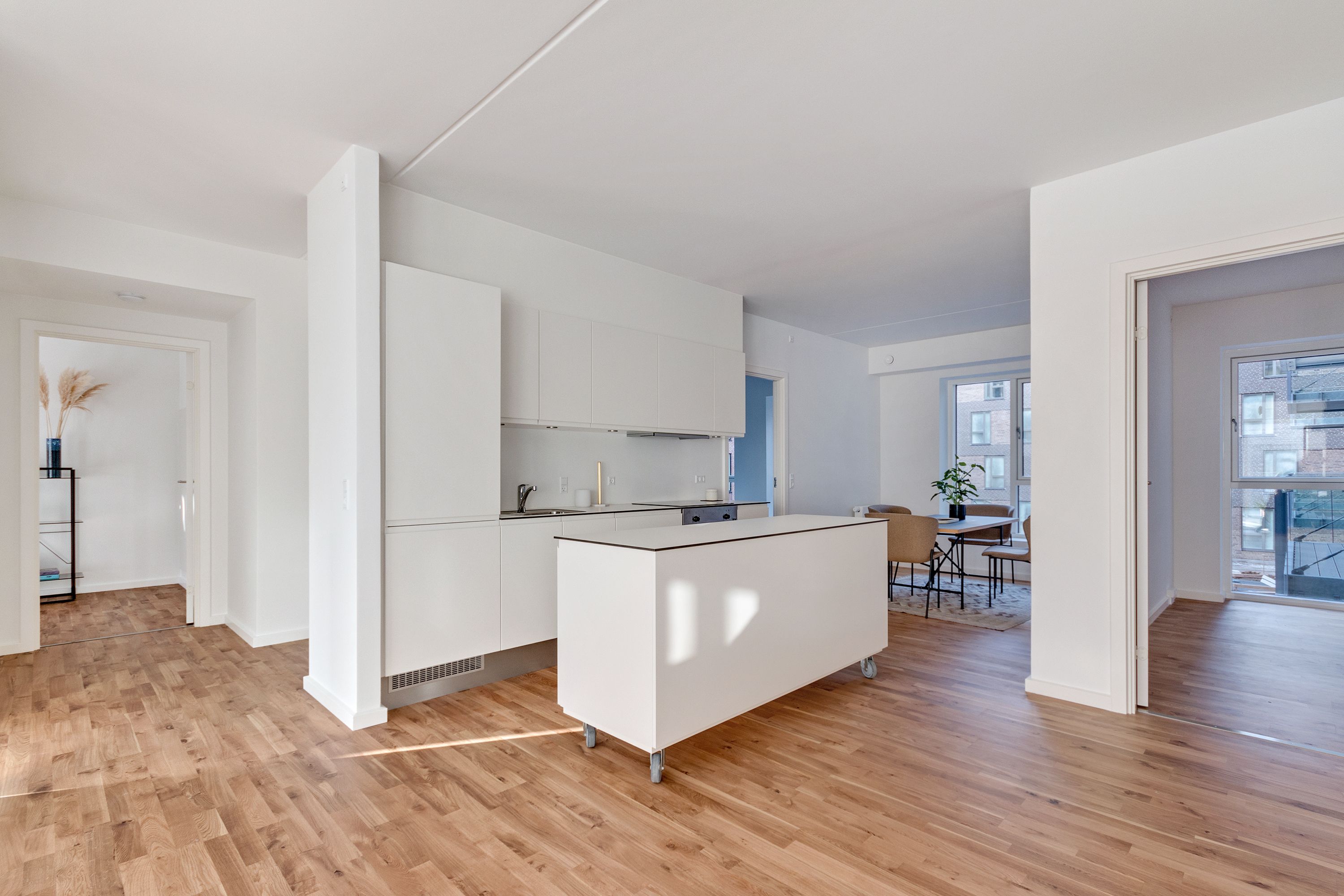 Velkommen til Halldorhus! Lejlighederne er indrettet med fokus på udeliv og lys. Fra 1. sal og opefter har alle boliger enten fransk altan eller almindelig altan, mens stuelejlighederne har direkte udgang til egen flisebelagt terrasse med udsigt til det grønne fælles gårdrum. De øverste lejligheder har desuden privat, tilbagetrukket tagterrasse, som giver et eksklusivt og ugeneret uderum med ekstra plads til ophold og nydelse. Bebyggelsens hjerte udgøres af et unikt og indbydende gårdmiljø, der fungerer som en grøn oase for beboerne. Her er der rig mulighed for både leg, afslapning og fællesskab – hvad enten børnene leger trygt, kaffen nydes i de hyggelige siddezoner, eller cyklen parkeres let og bekvemt. De frodige omgivelser med smukke plante- og blomsterbede skaber en rolig og stemningsfuld atmosfære midt i bebyggelsen. Der tages forbehold for fejl og evt. lejereguleringer. OBS: Der er 9 mdr. bindingsperiode og 3 mdr. opsigelse. Lejemålet er tidsubegrænset. Billeder er fra prøvebolig.