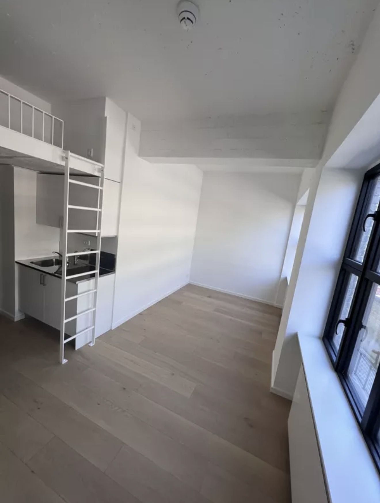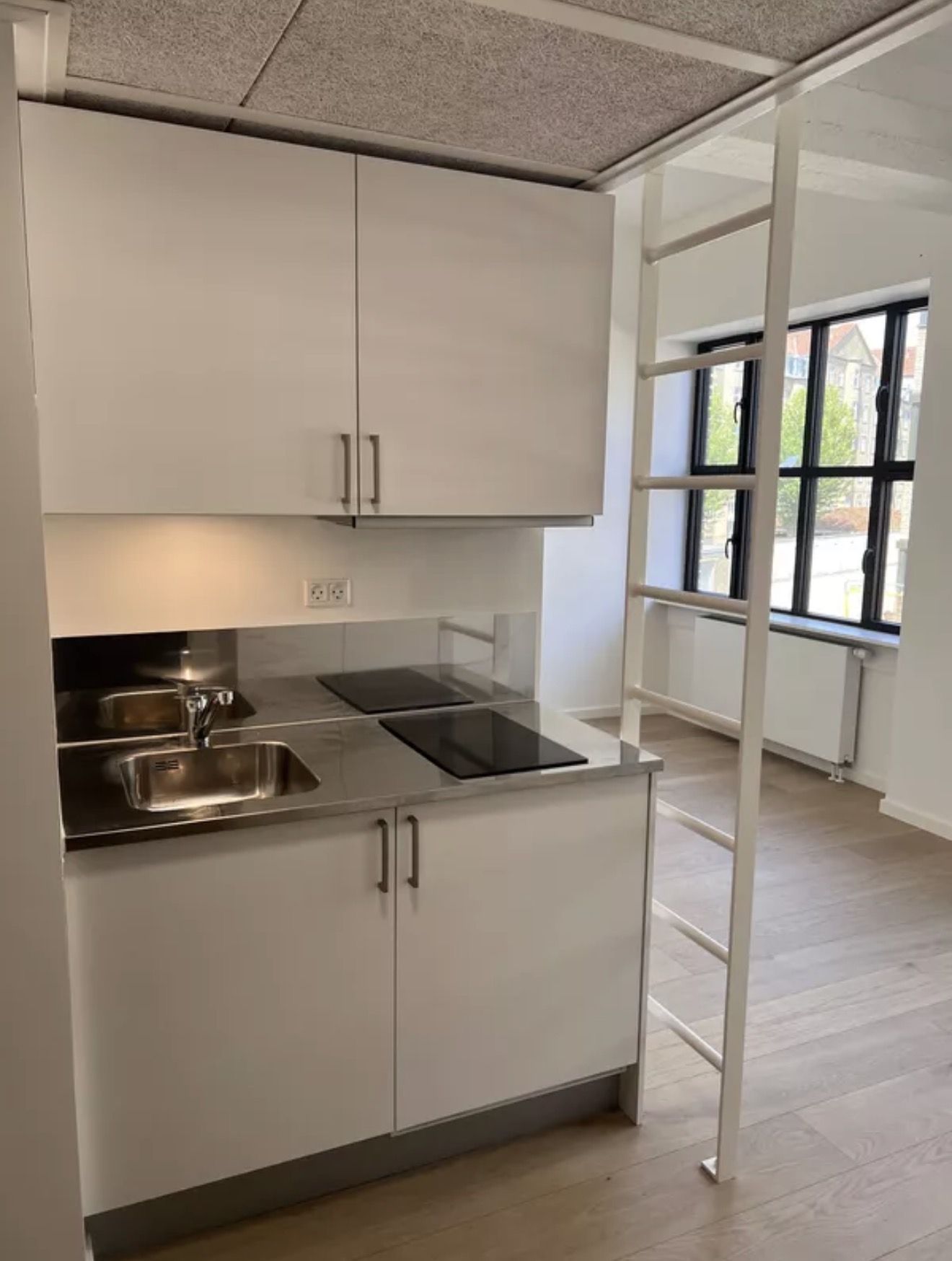 The studio further comes with wall-mounted shelves, a wall lamp, a hook for a ceiling lamp of your own, blackout curtain and hooks for outerwear.