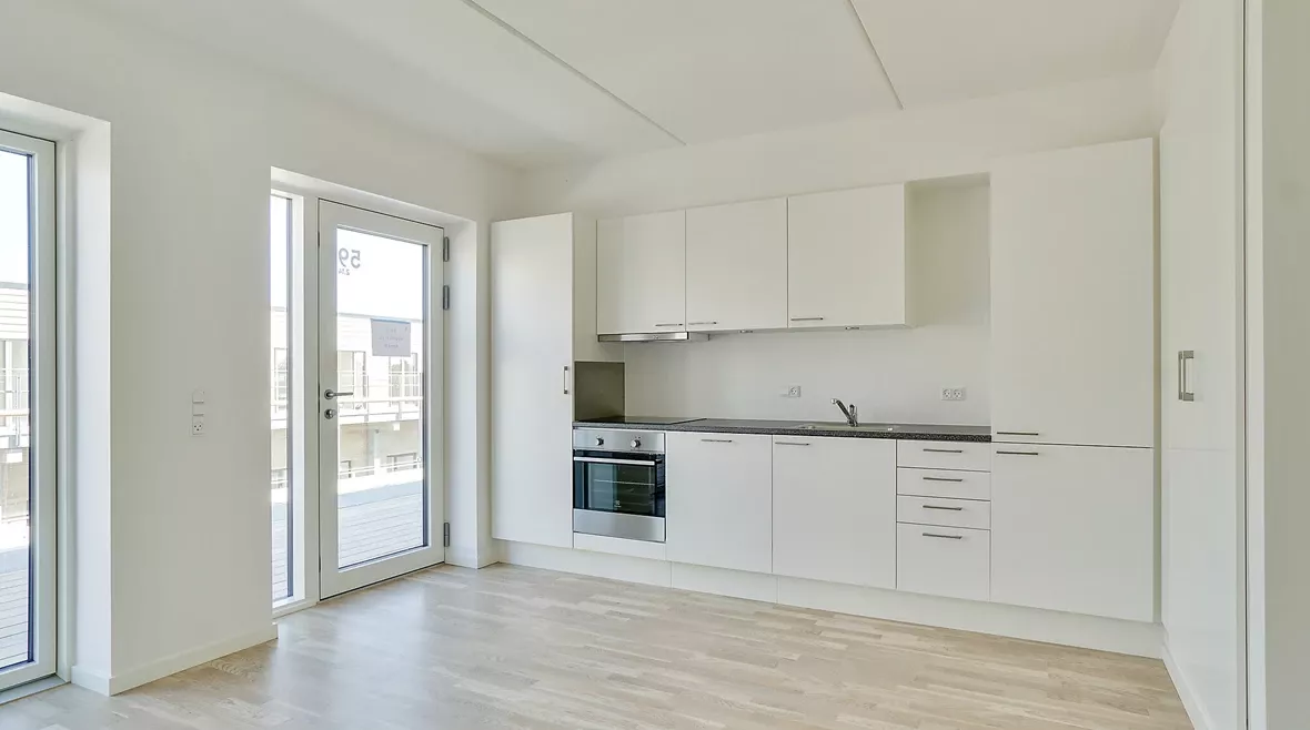 Lejligheden byder på et stilrent, lyst HTH-køkken og et flot badeværelse i gode materialer. Boligen har en naturlig opdeling mellem værelsesdelen og køkken-alrummet, adskilt af en New Yorker-dør, som giver hjemmet et eksklusivt og luftigt udtryk.