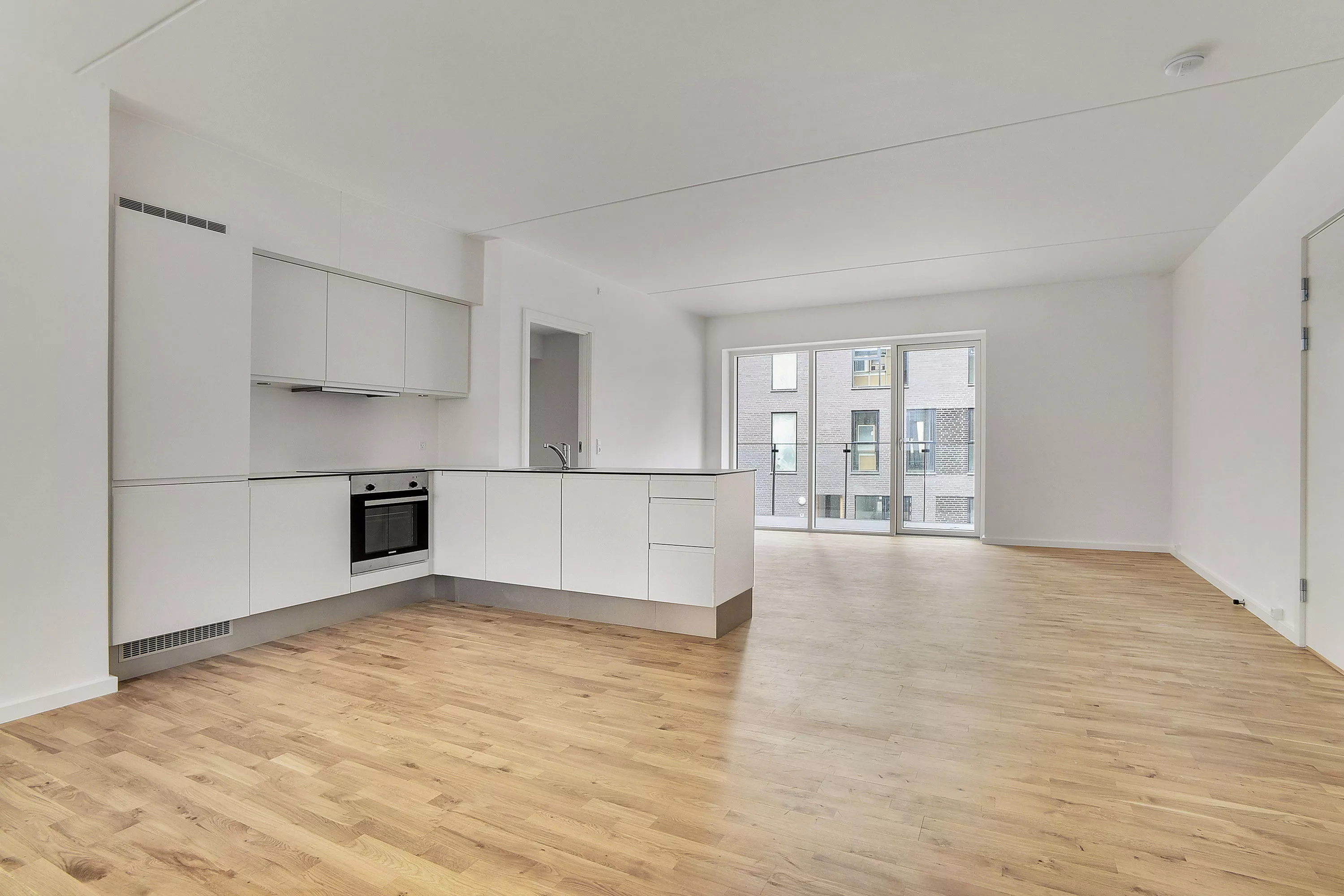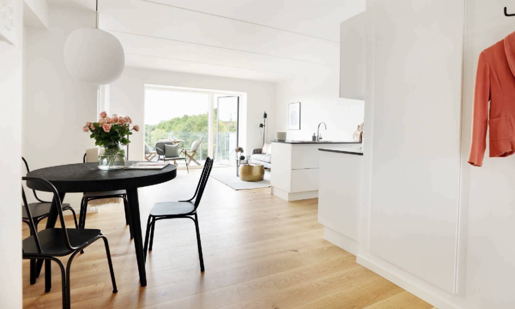 Det elegante køkken er udstyret med integrerede hårde hvidevarer – herunder opvaskemaskine, køle/fryseskab, ovn, kogeplader og emhætte – og ligger i åben forbindelse med stuen, som har plads til både spisebord og sofaarrangement. Fra stuen er der udgang til lejlighedens altan, hvor du kan nyde et øjeblik i solen.