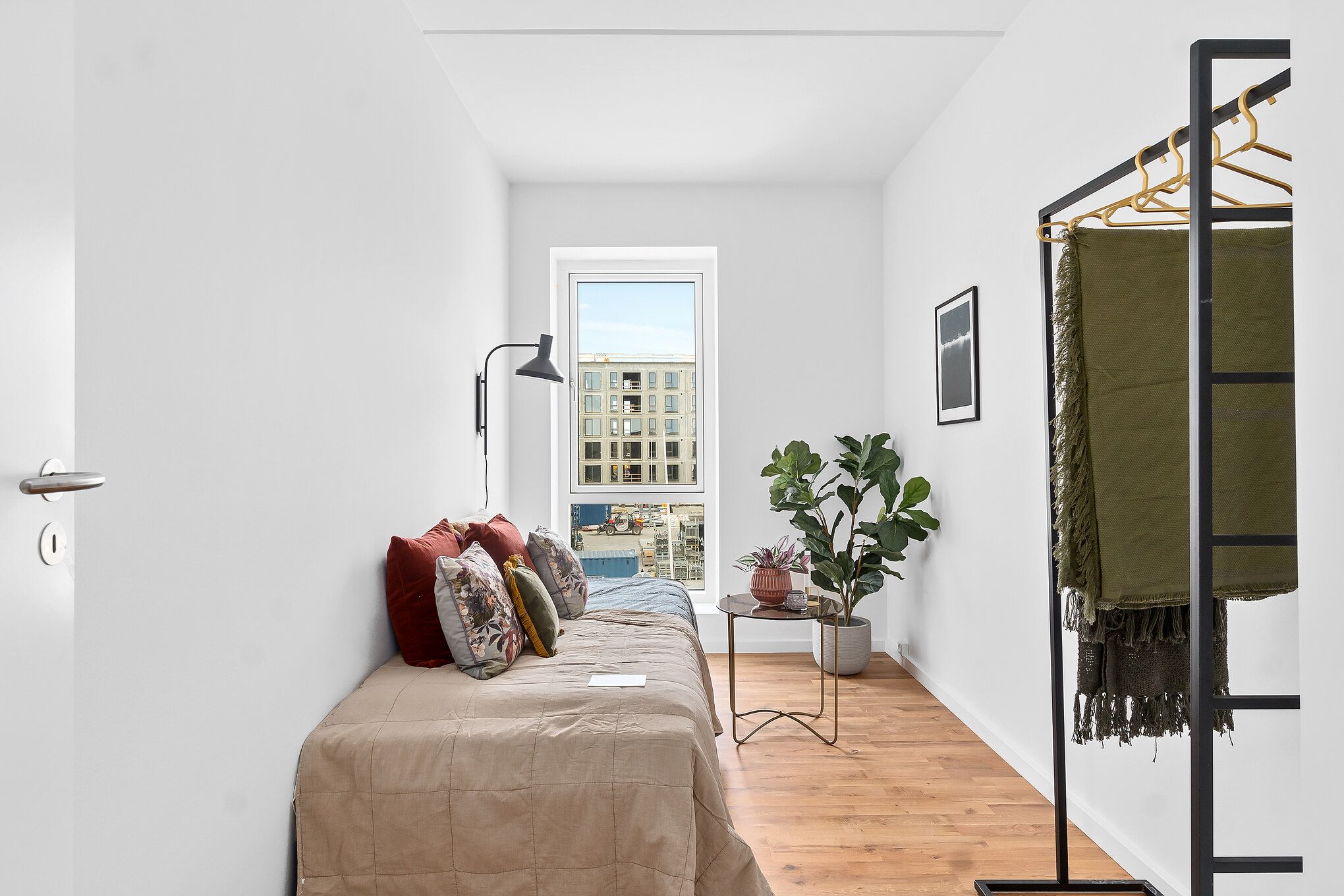Lejligheden er opført i skandinavisk stil, der får den til at fremstå moderne, lys og indbydende. De store vinduer lukker store mængder dagslys ind og skaber derved en varm atmosfære og et flot spil på det lyse egetræsgulv. Lejlighedens hjerte er et centralt opholdsrum med åbent køkken og spiseplads. Det diskrete, hvide køkken er fra Invita med hårde hvidevarer fra Siemens. På badeværelset er der fliser på gulvet og i brusekabinen. Der er desuden vaskemaskine og tørretumbler fra Siemens. I mastersoveværelset findes indbyggede skabe til opbevaring. Det er muligt at ansøge om husdyrtilladelse i alle vores lejemål. OBS: ønskes der mål af lejligheden skal du selv huske opmålings udstyr til fremvisning, da der ikke er mål på plantegningen.