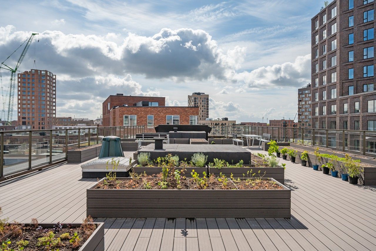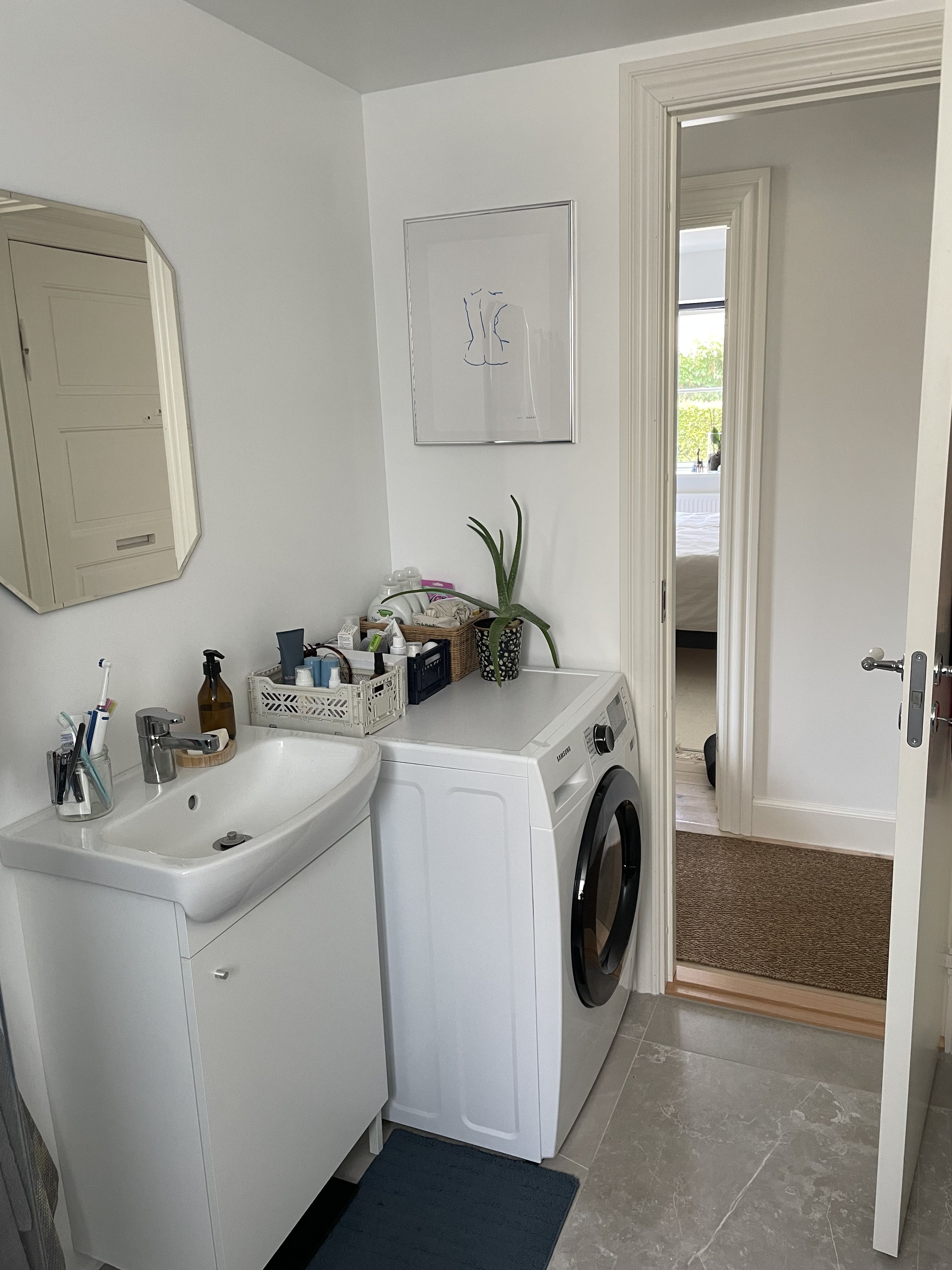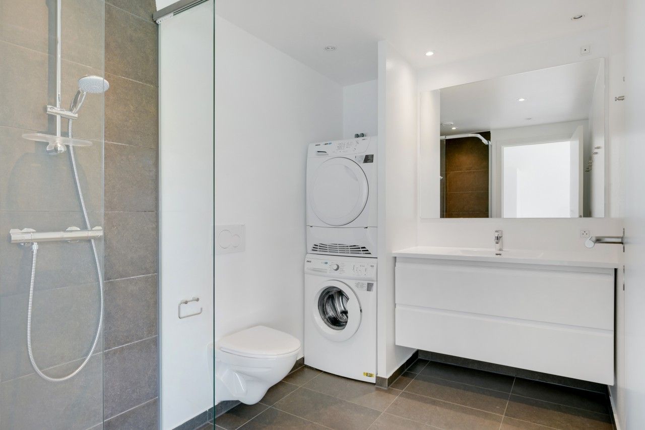 Lejligheden byder på et stilrent, køkken i hvide elementer med grålig bordplads på begge sider, indbygget ovn, kogezone, kombi tørreog vaskemaskine og opvaskemaskine. Her er plads til at lave mad i ro og mag, mens du har fint kig til fællesarealerne udenfor. Badeværelset er moderne med separat bruseniche og opbevaring under vasken.