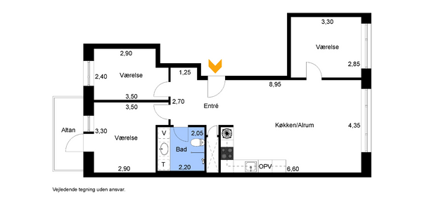 Rummelig entre, med plads til overtøj og sko, 3 gode værelser og stort køkken alrum med plads til spiseafdeling og sofaarrangement. Fra stuen er der udgang til den dejlige altan. Lejlighedens badeværelse byder på separat brus samt vaskemaskine og tørretumbler.