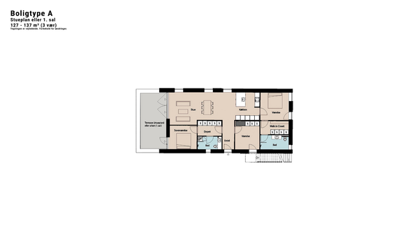 På lejlighedens nederste etage finder du køkkenet, der er udstyret med ovn, kogesektion, køle- og fryseskab samt opvaskemaskine fra Electrolux. Fra køkkenet føres du ind i en dejlig lys stue, som har loft til kip og adgang til en stor altan. Herudover findes der to rummelige værelser, hvor det største har fire indbyggede skabe. Imellem de to værelser ligger et rummeligt badeværelse med separat bruseniche og vaskesøjle med vaskemaskine og tørretumbler fra Electrolux.