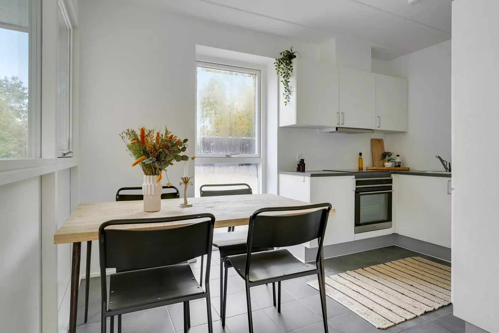 Boligen: Denne hyggelige lejlighed på 103kvm er både til familien der kan lide meget plads, men er også delevenlig, hvilket gør den ideel til dem, der søger en fælles boligoplevelse. Beliggende på første sal, ankommer du til lejligheden via en bred opgang. En entre leder til to store stuer en-suite hvoraf den ene kan benyttes til værelse. For enden ad gangen endnu et stort værelse med udsigt over fælleshaven. Stort badeværelse med separat bruseafsnit, og stort reelt køkken. Køkkenet indeholder både komfur, køleskab og opvaskemaskine.