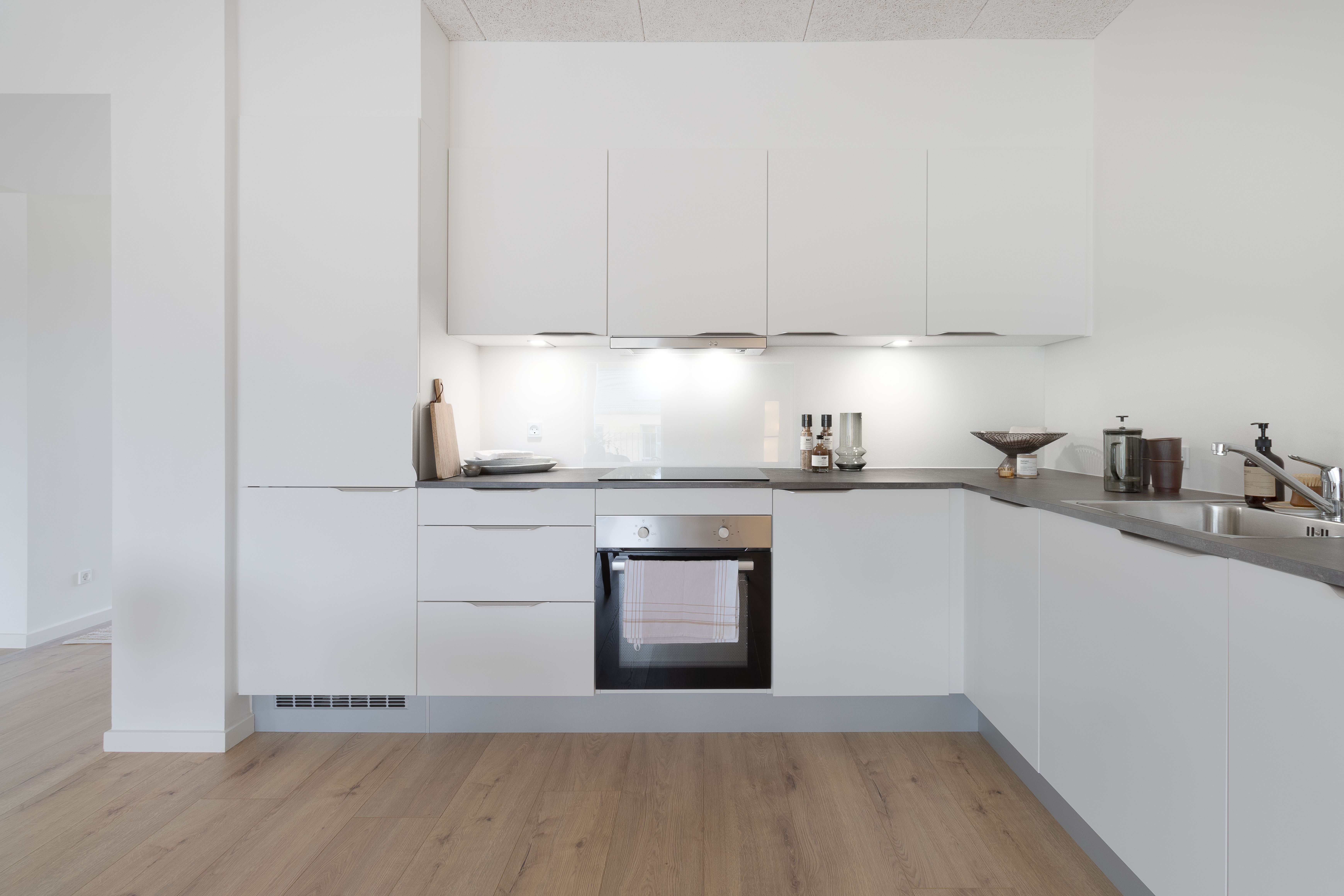 Flot køkken fra Invita i elegant lyst tidløst design og med lære hårde hvidevarer: Siemens indbygningsovn med pyrolyse, Siemens induktionskogeplade, Siemens køle/fryseskab, Siemens opvaskemaskine.