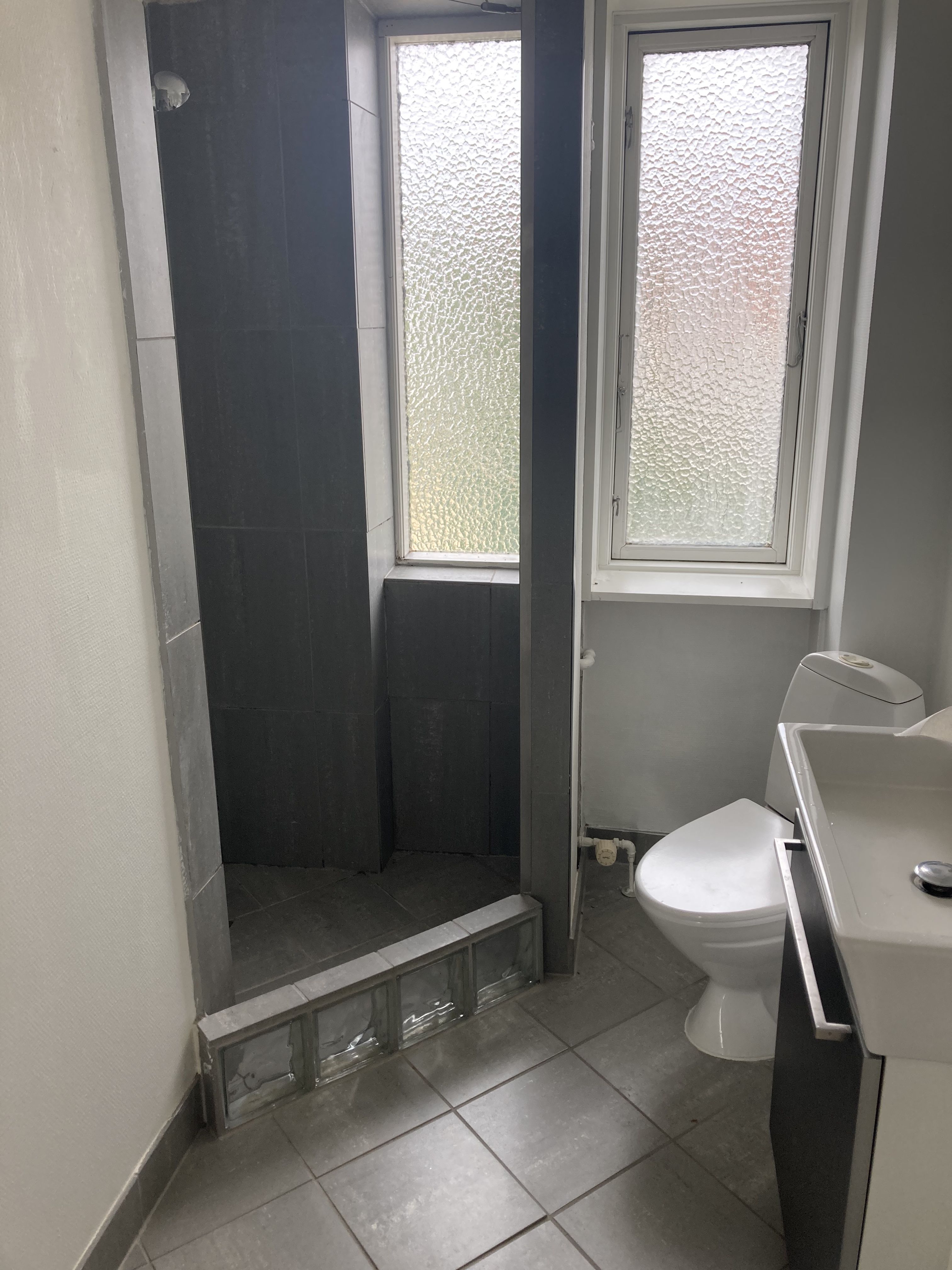 Badeværelse, der ligeledes er flot moderniseret med elementer fra Invita samt med nyere armaturer og med kombineret vaskemaskine-/tørretumbler.