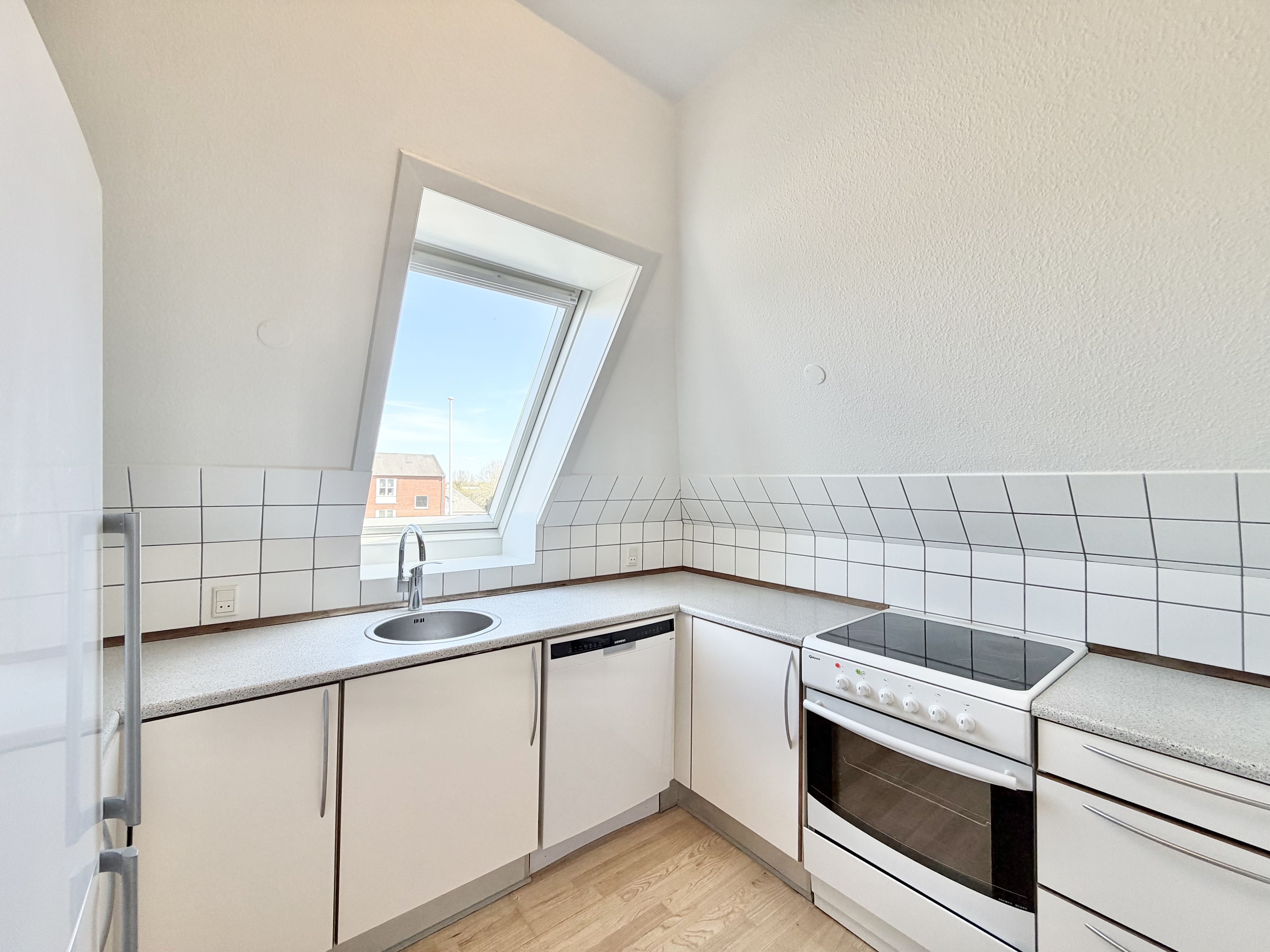 Hyggelig lejlighed med udgang til terrasse fra køkken, lys stue og godt stort soveværelse.