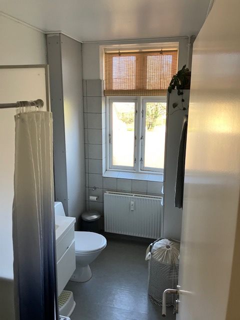 Badeværelset er moderniseret med pæne fliser, separat bruseniche og vaskefaciliteter. Vinduerne er relativt nye og sikrer et behageligt lysindfald i hele boligen.