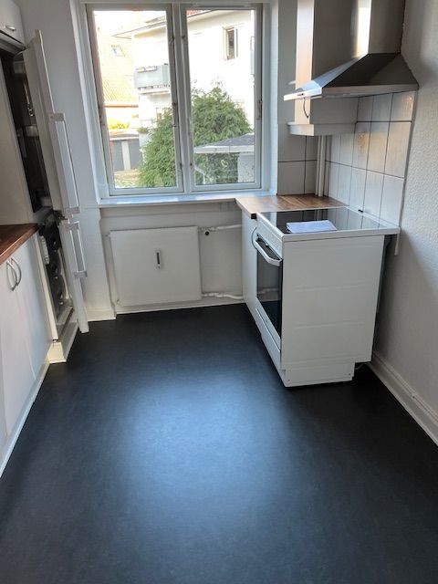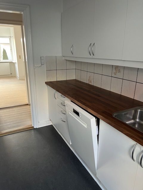Nymalet og nyslebet. Pænt hvidt køkken og pænt badeværelse med grå klinker.