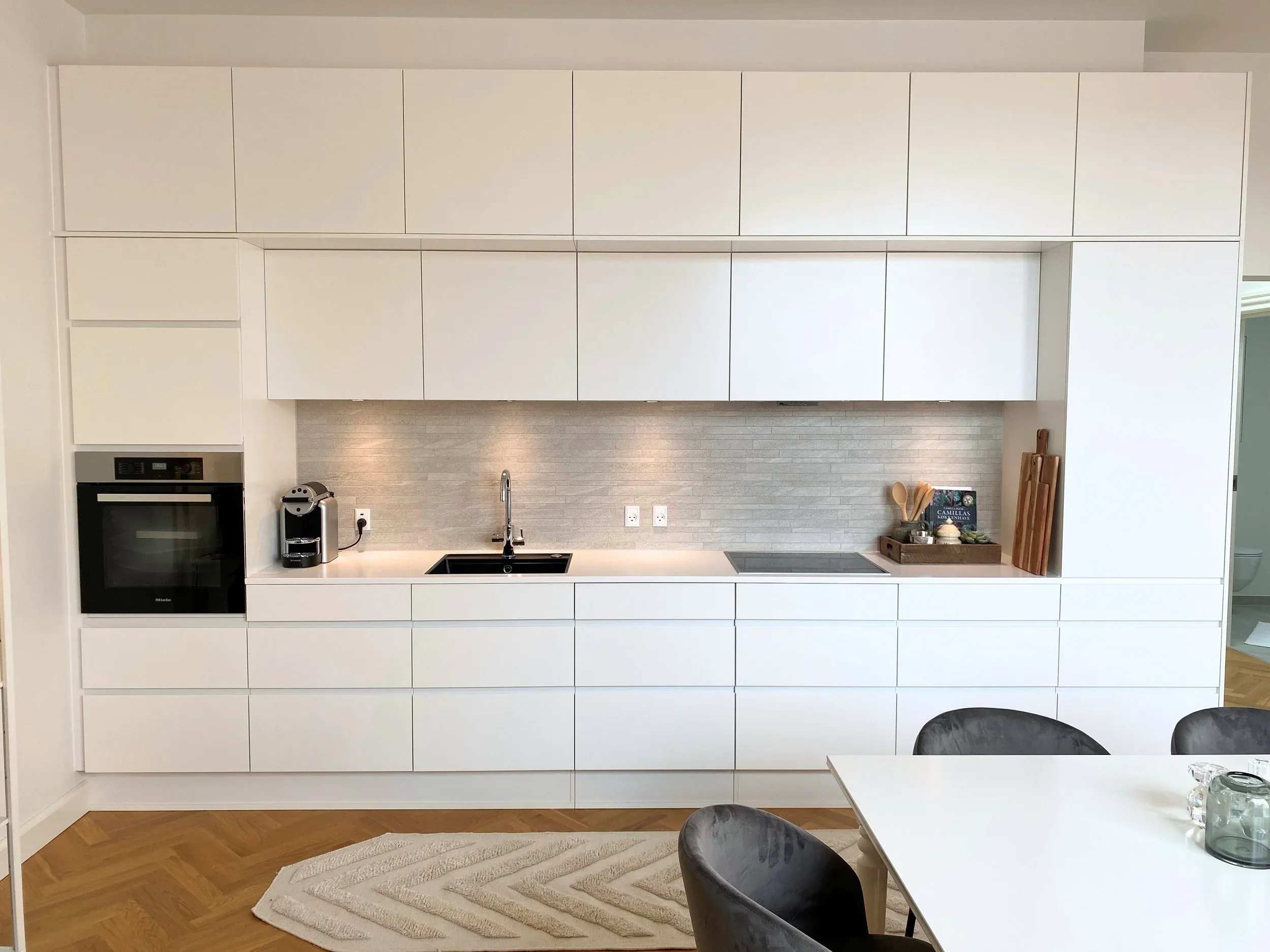 Lejlighederne byder på tids-løst design og kvalitetsmaterialer, der sammen med de store vinduespartier og hvidmalede vægge medfører en lys og rummelig atmosfære i alle rum. Når du træder ind i lejlighederne, bliver du mødt af en indbydende entré, der fører til den åbne stue, som er forbundet med et veludstyret køkken. Køkkenet er moderne med hvide skabsfronter og god opbevaringsplads.