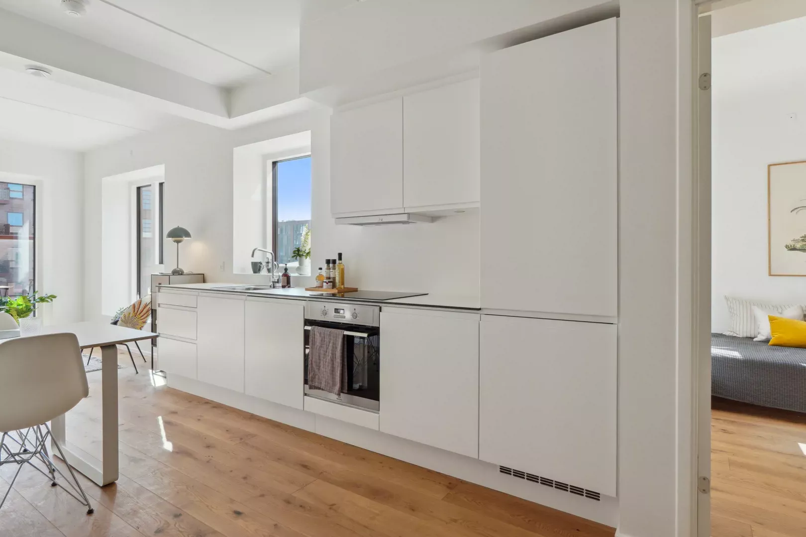 Åbent køkkenalrum: Moderne køkken med spiseplads og direkte adgang til en dejlig, lukket gårdhave.