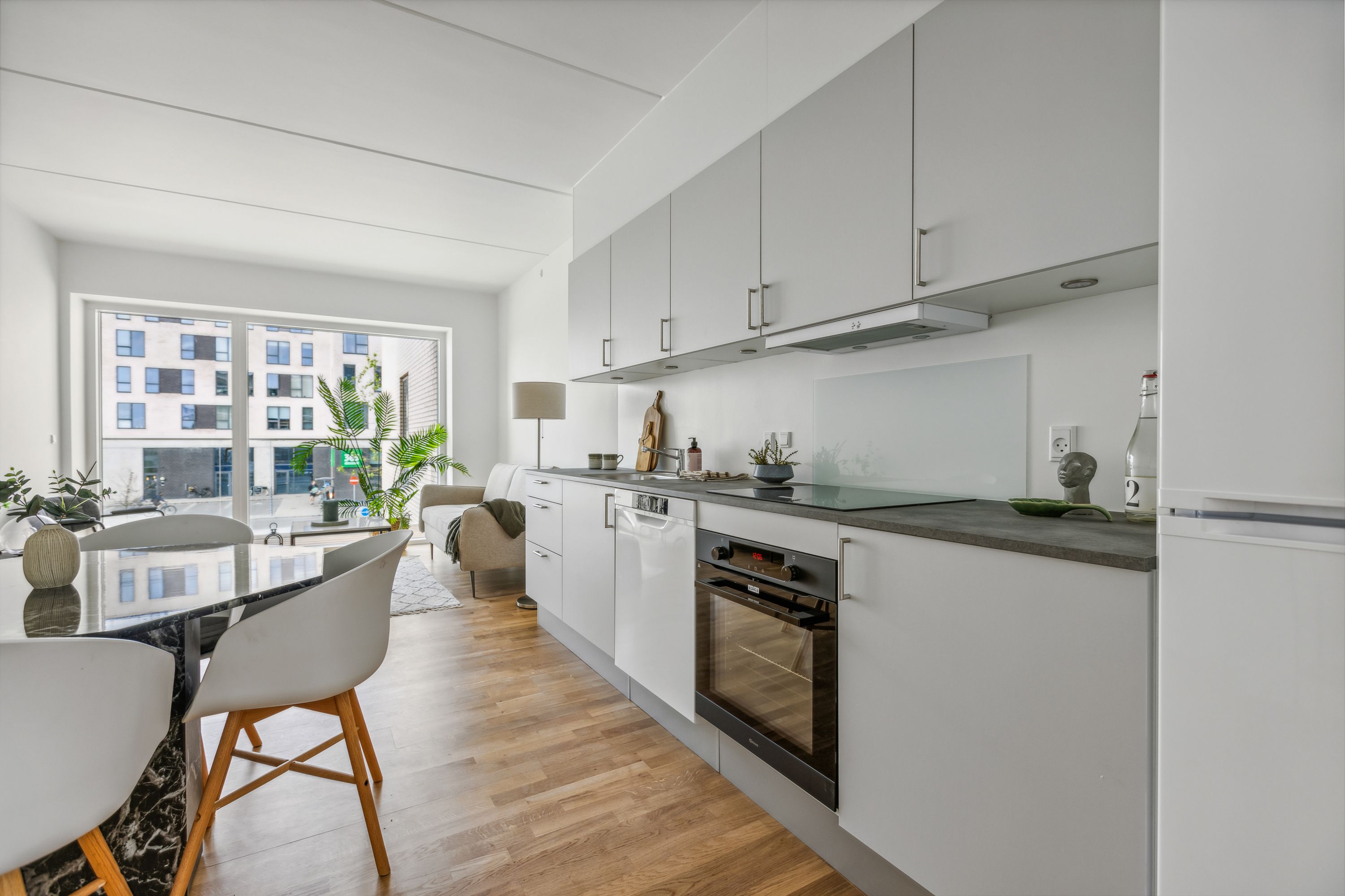 Lejligheden byder på et stort og indbydende køkken-alrum, hvor et bredt vinduesparti sikrer et fantastisk lysindfald og en behagelig atmosfære. De to store soveværelser er udstyret med indbyggede skabe og giver rig mulighed for både opbevaring og indretning.