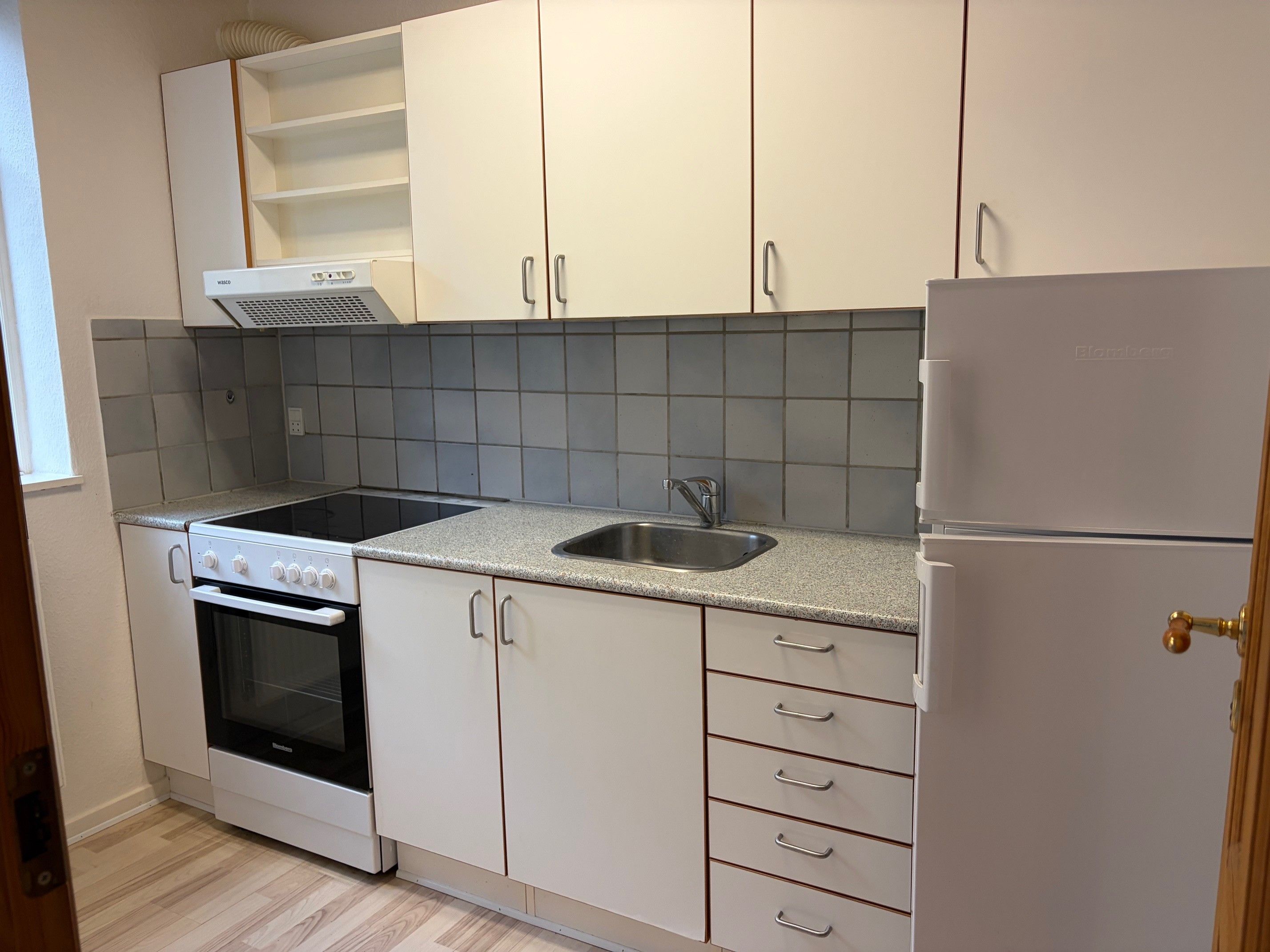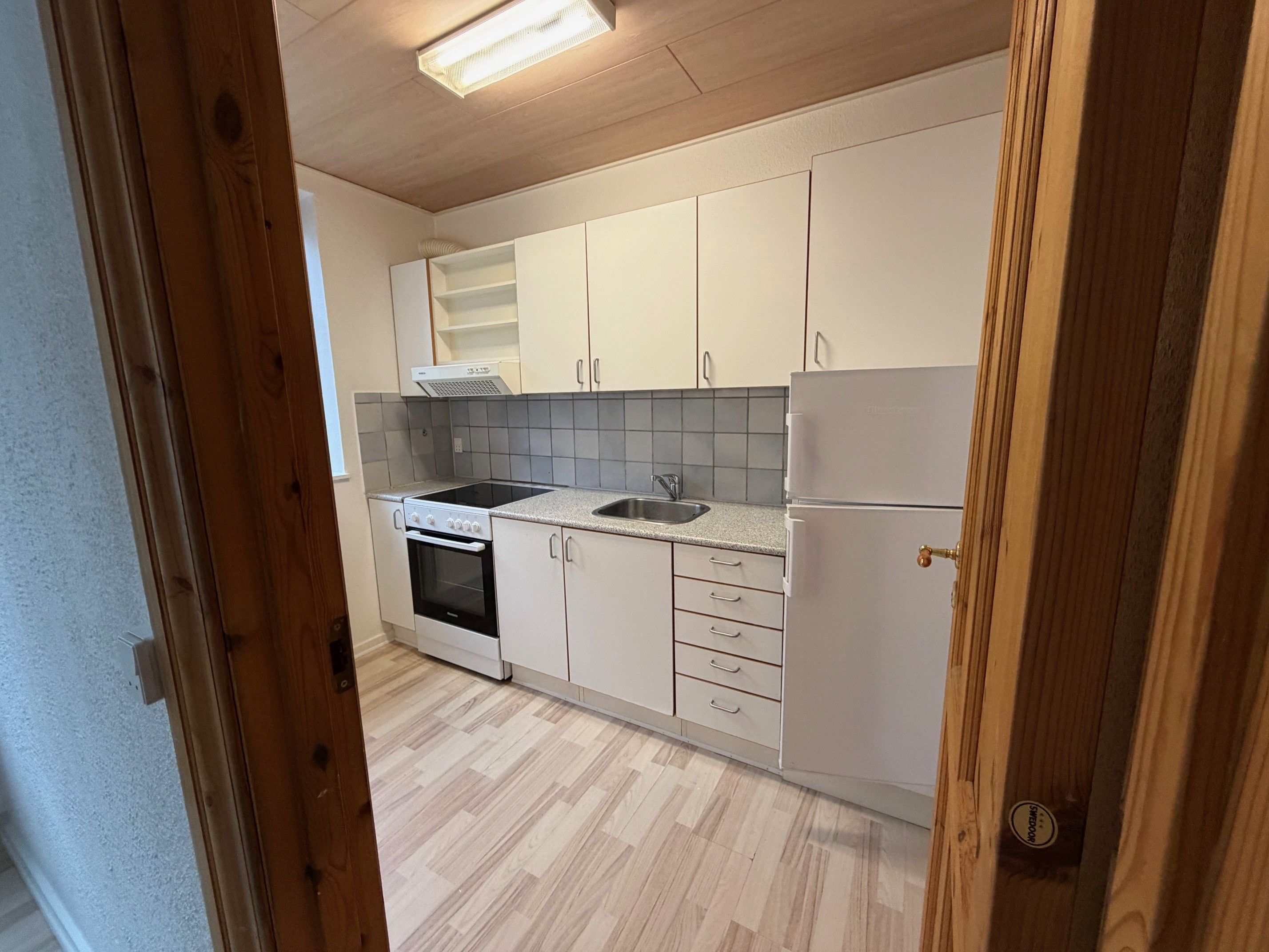 Køkkenet er et klassisk, smalt køkken med hvide elementer og fliser, der er lette at holde. Her er ovn med kogeplader, emhætte og højt køle-/fryseskab samt naturligt dagslys fra vinduet. Indretningen er enkel og praktisk, så madlavningen glider let i hverdagen.