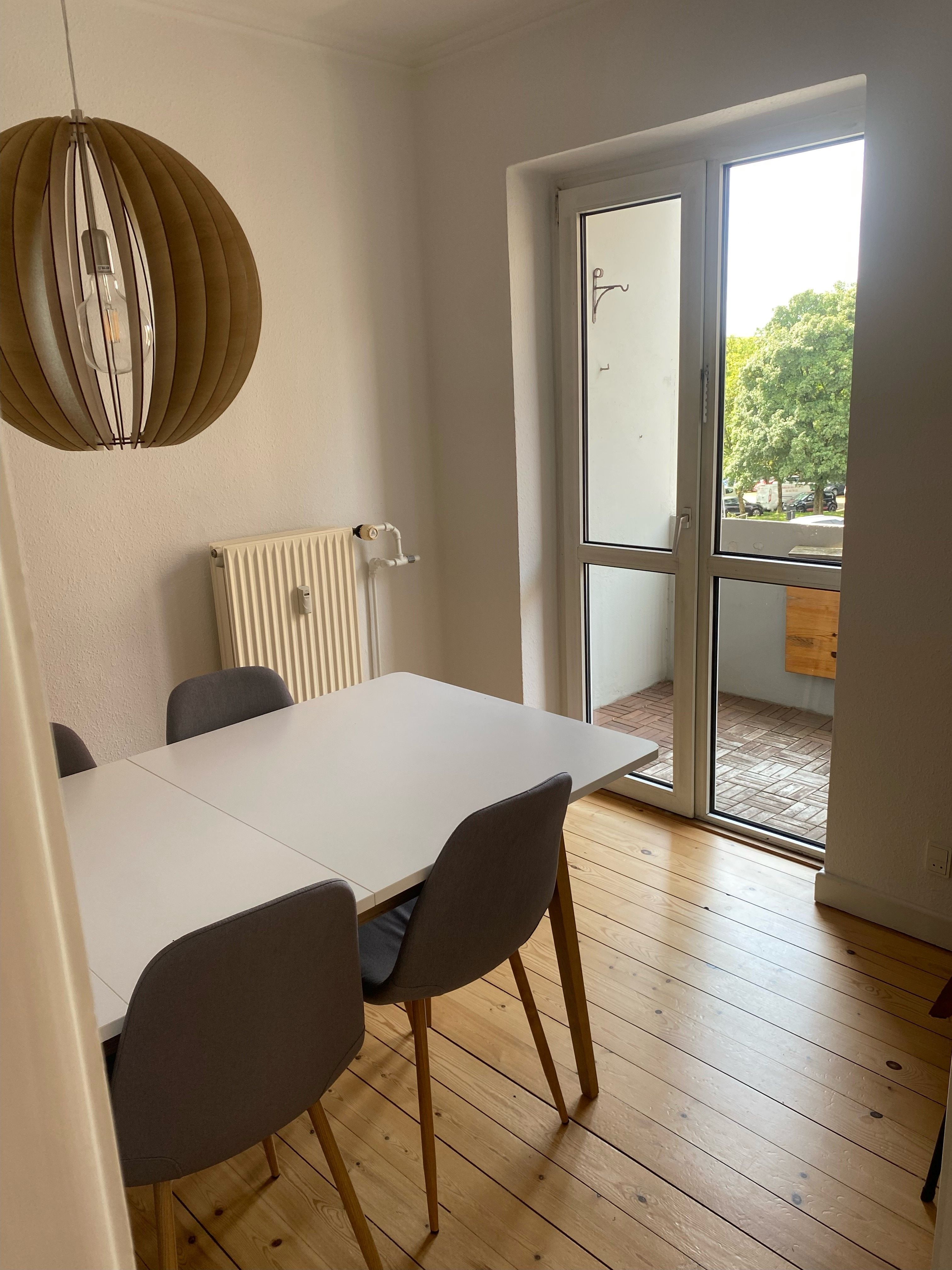 Fra opholdsrummet er der udgang til en lang, overdækket altan med et fint kig til rolige, grønne omgivelser og klassiske murstensejendomme – et dejligt sted til morgenkaffen og et pusterum i hverdagen.