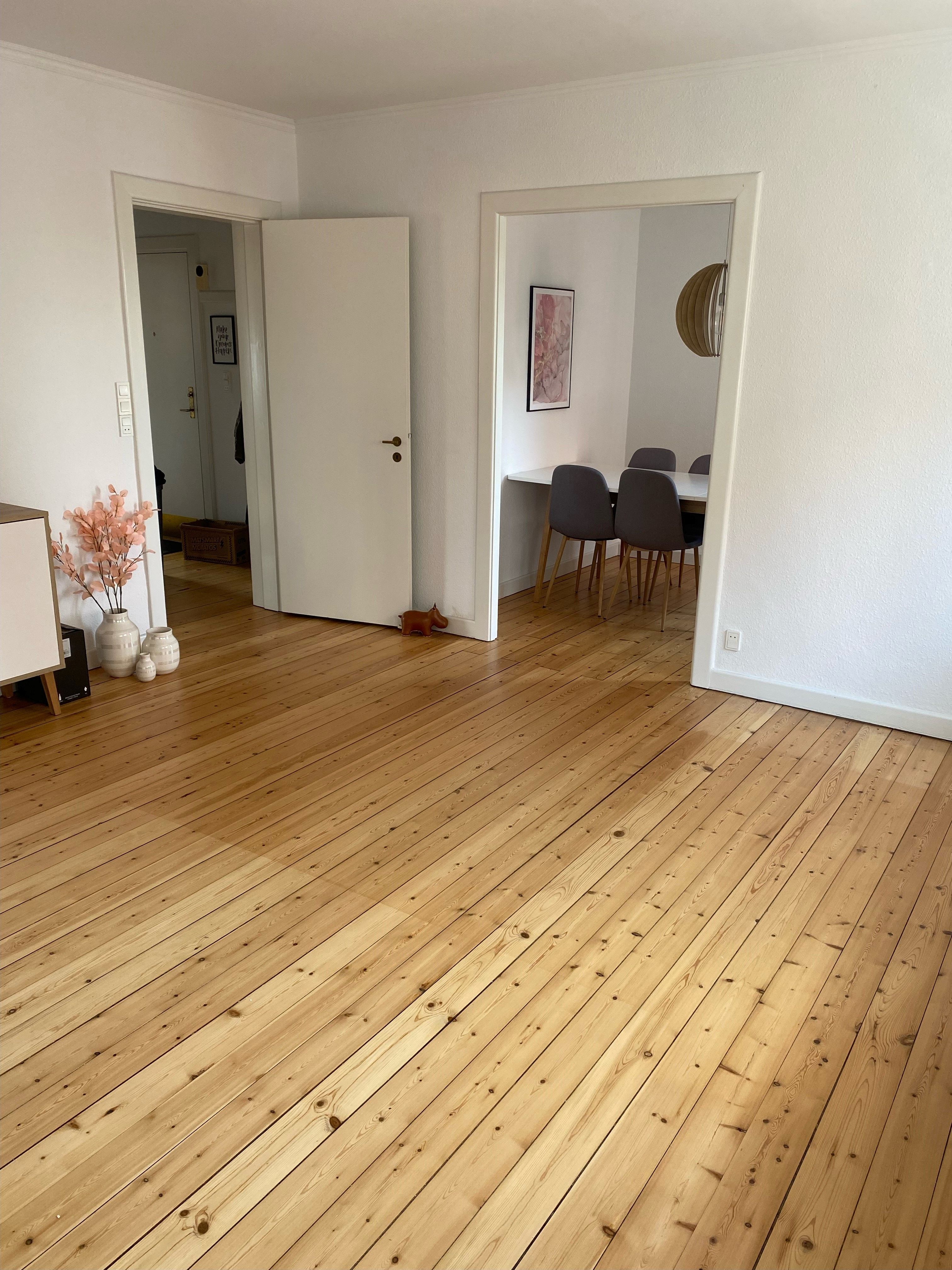 Opholdszonen består af to store stuer med smukke plankegulve, hvide vægge og brede vinduespartier, der trækker masser af dagslys ind. Her er fin plads til både sofa- og spiseplads samt et soveværelse, køkken og bad.