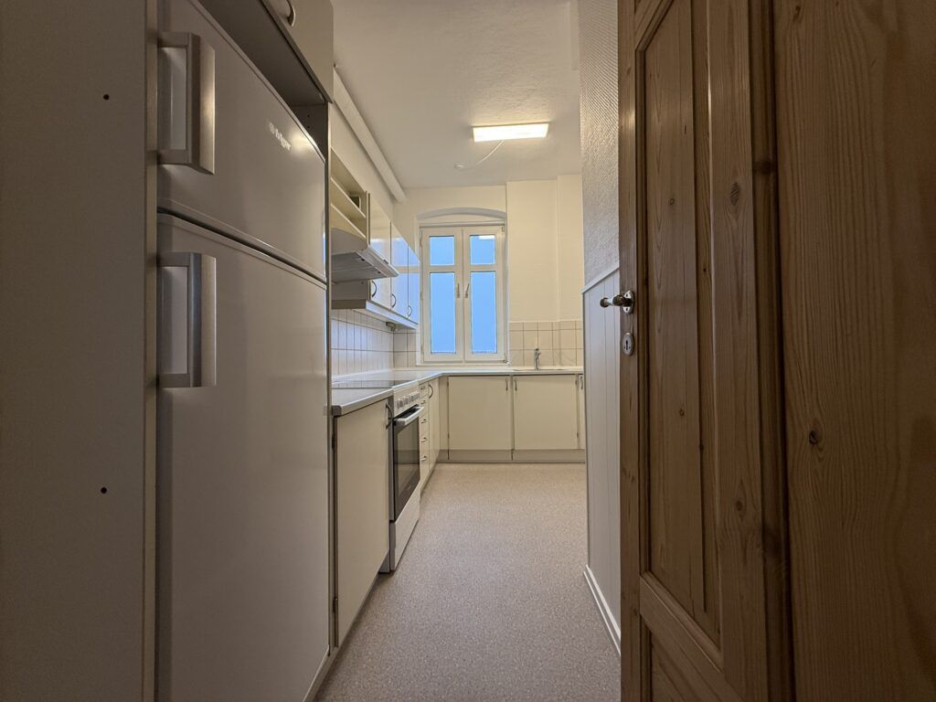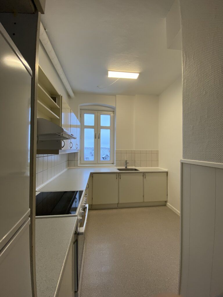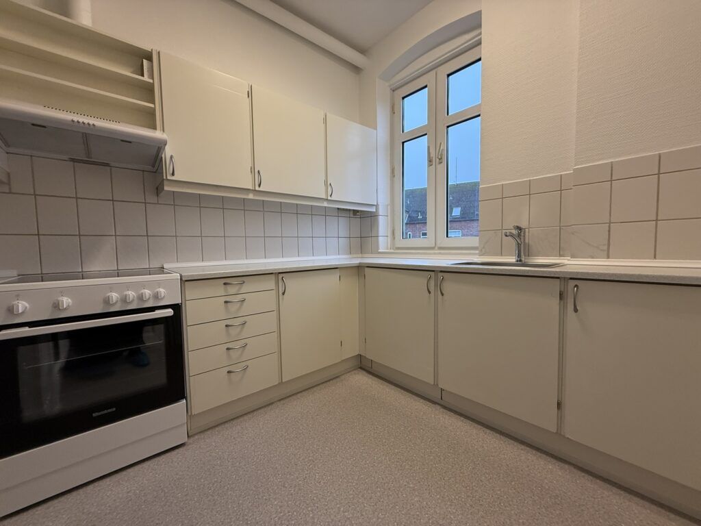 Endvidere er lejligheden indrettet med et rummeligt og lyst køkken, som byder på faciliteter som køle- fryseskab, komfur og emhætte. Grundet køkkenets gode størrelse er der god med plads til en mindre spiseplads til hverdagsbrug.
