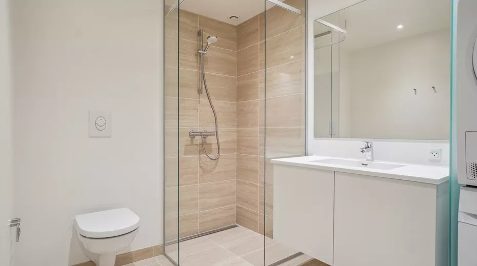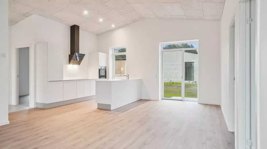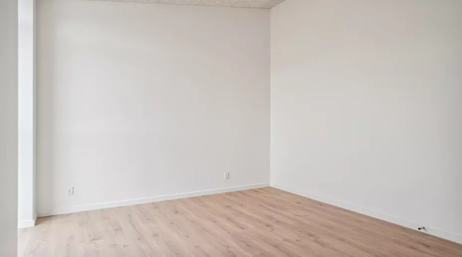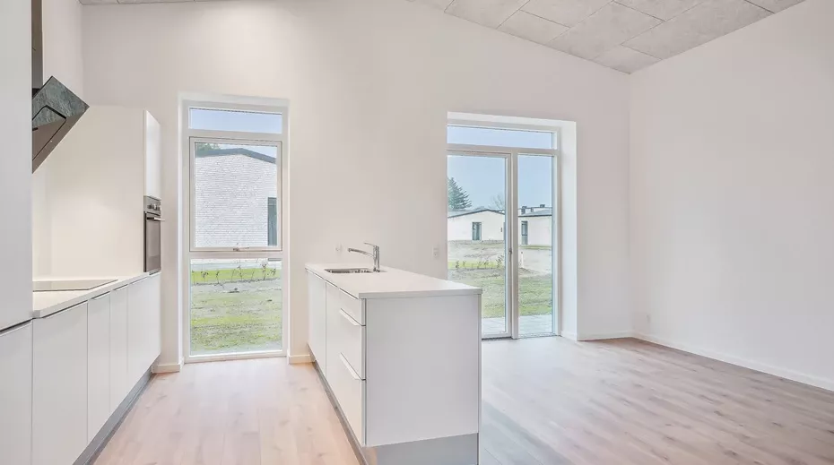 Indgangen til lejligheden går gennem et stilfuldt indgangsparti, der leder videre til entréen. Herfra er der adgang til det moderne badeværelse samt en åben stue/køkken-alrum. Køkkenet er holdt i en elegant, hvid stil med alle nødvendige faciliteter: indbygget opvaskemaskine, opretstående ovn, kogeplade og køle-/fryseskab. Fra køkkenet fører en lille gang videre til to rummelige værelser.