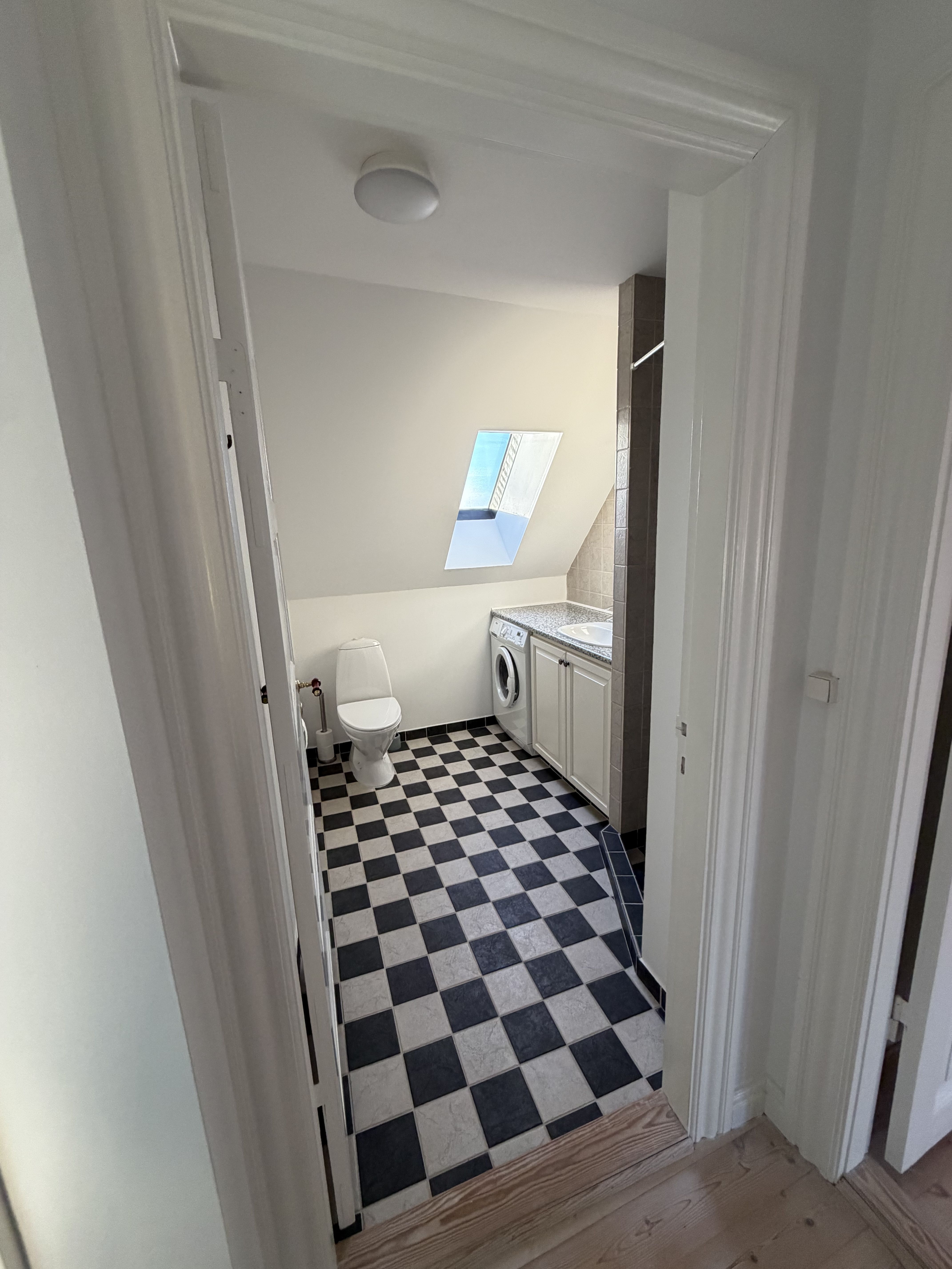 Indeholder: Entre med indbyggede skabe og dørtelefon, pænt flisebadeværelse med plads til vaskemaskine, pænt køkken, stor stue samt soveværelse med ed indbyggede skabe.