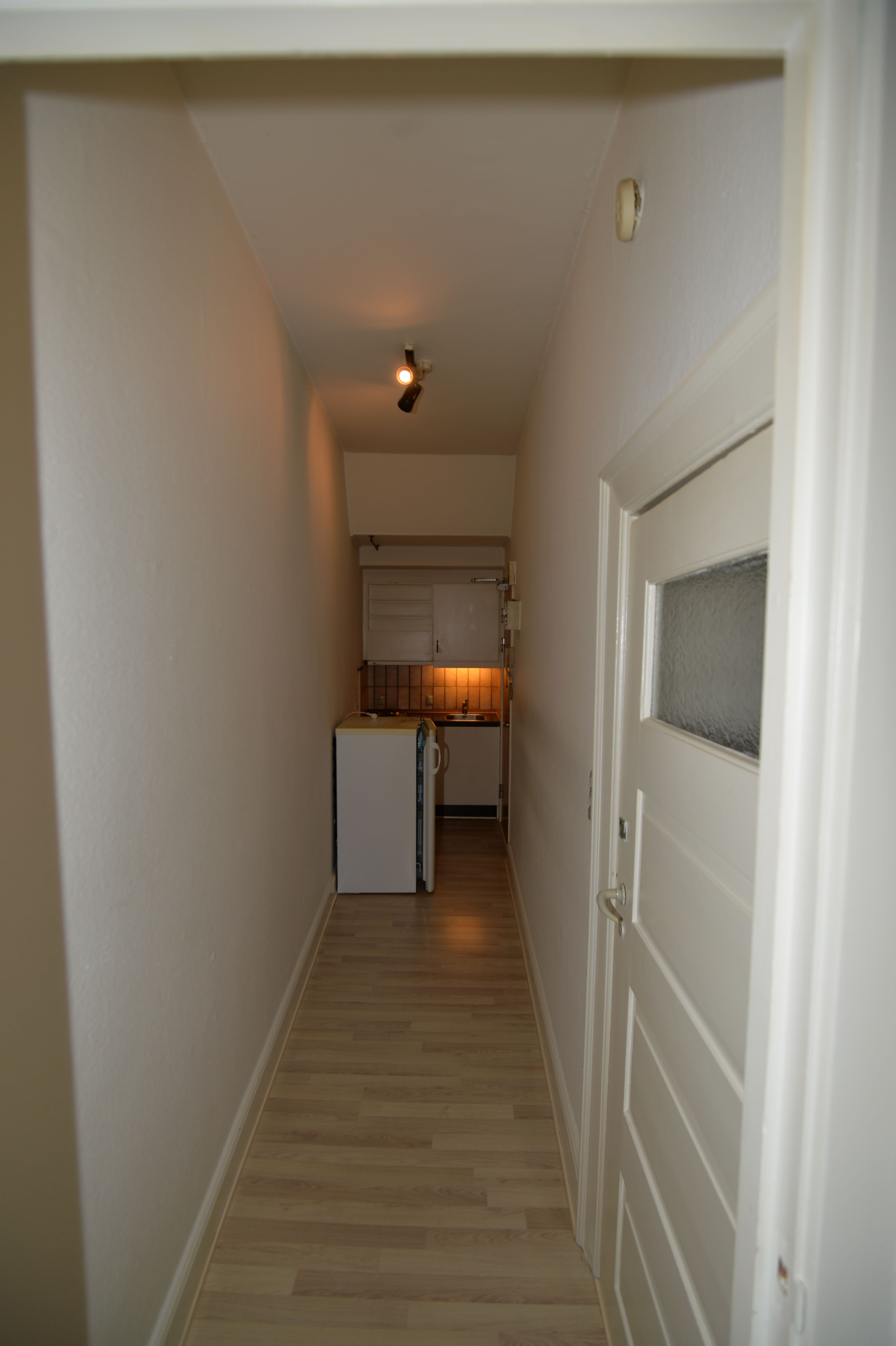 Bylejlighed. Hyggelig 1-værelses lejlighed, beliggende midt i Svendborg centrum. Indeholder værelse med klædeskab og lille thekøkken med køleskab og kogeplader samt badeværelse. Vand er inklusiv i huslejen. Aconto beløb inkluderer varme, el og internet. Fælles vaskeri. Mulighed for cykelparkering i fælles gård. Energimærke: D