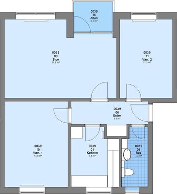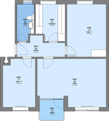 Lejligheden er på 1. sal og er 85 m2 - indeholder 3 værelser og et badeværelse og et køkken.