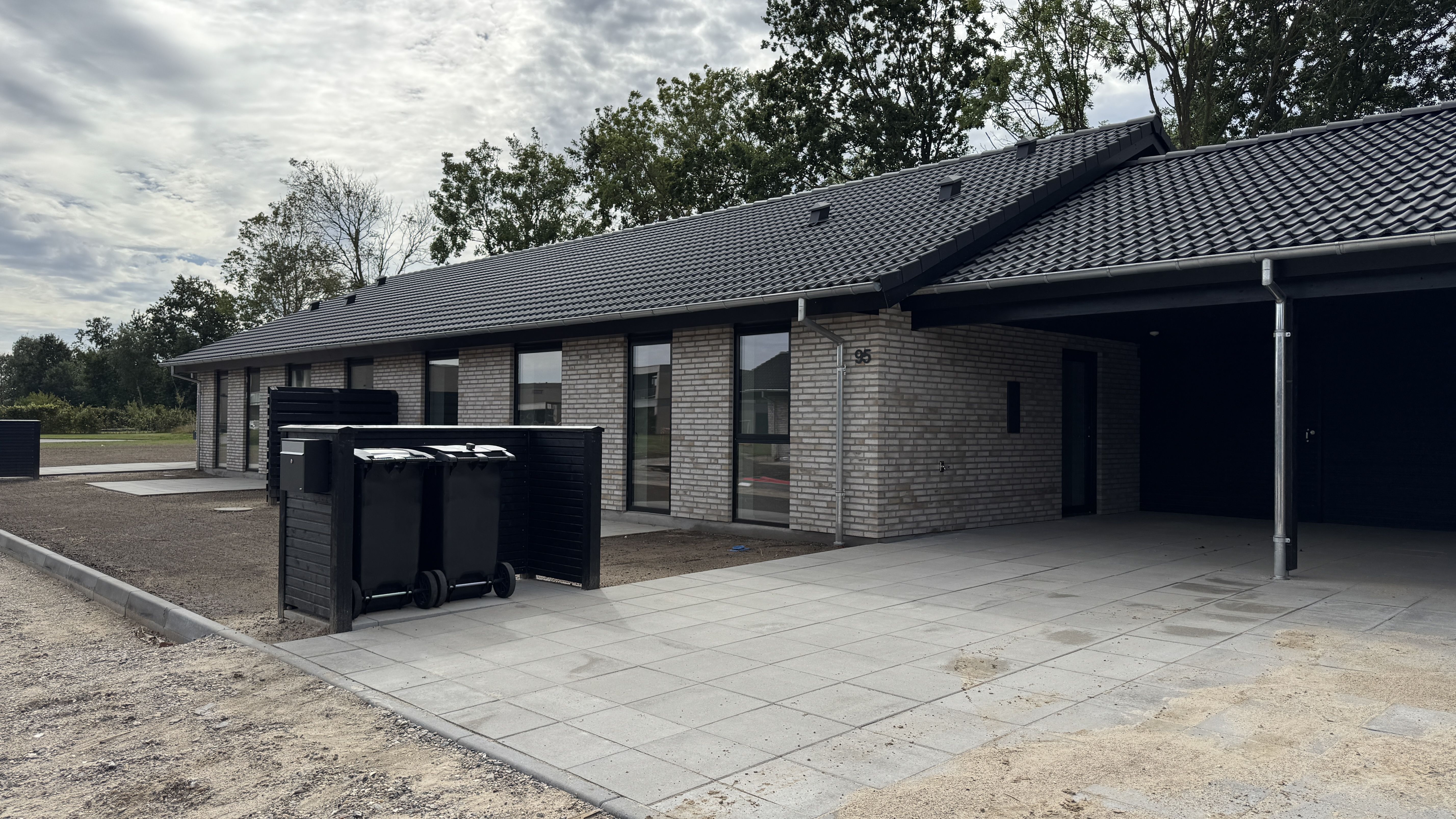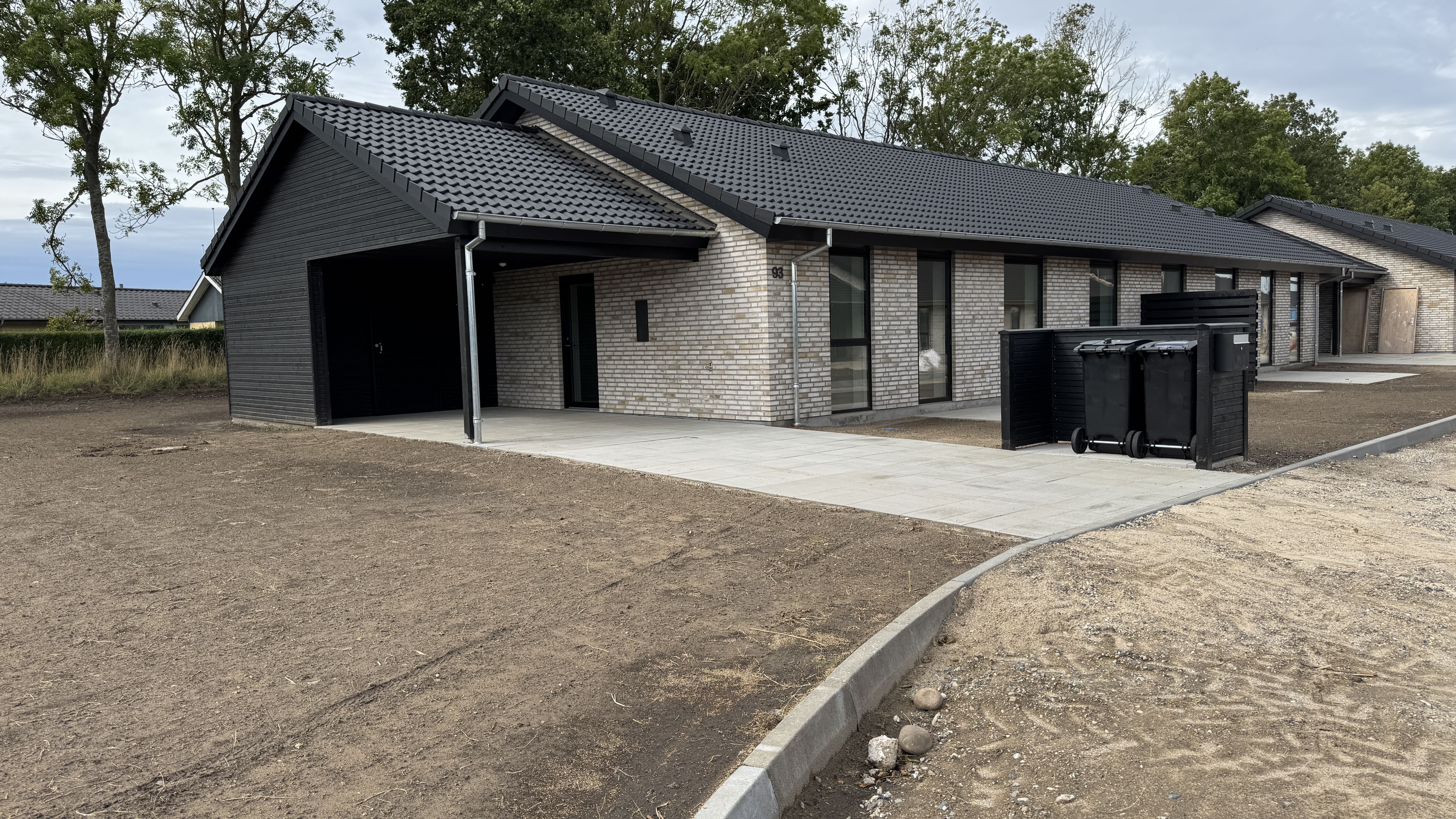 Der opføres carport og skur lige ved døren, fine flisebelagte terrasser og have på begge sider af husene.