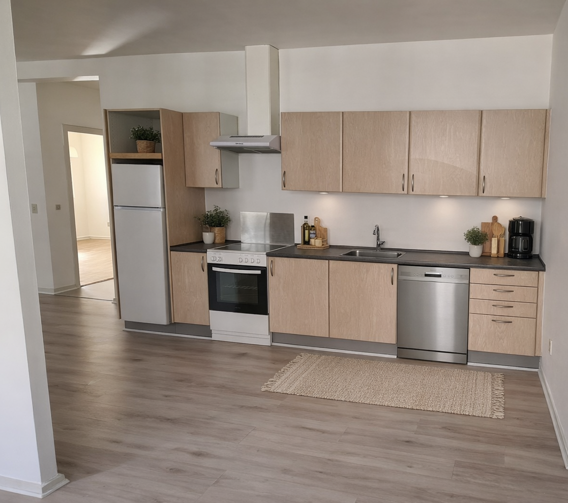 Køkkenet er fuldt udstyret med opvaskemaskine, ovn, komfur, køleskab med fryser samt emhætte.