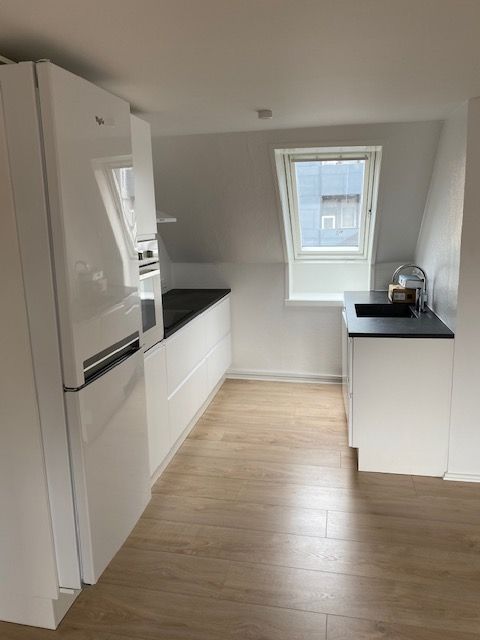 Lejligheden består af lyst køkken alrum med med HTH grebsløst køkken med integreret opvaskemaskine og køl/frys.