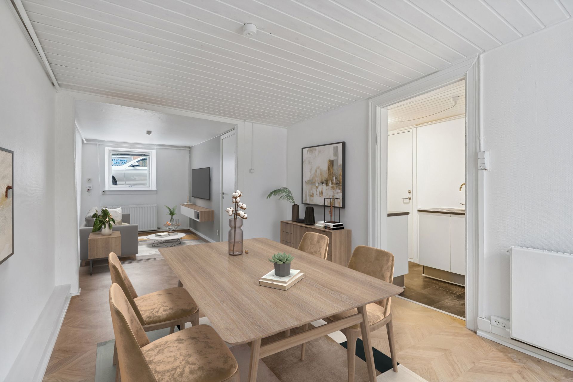 Lejligheden byder på et lækkert, hvidt og tidløst Invita-køkken, fuldt udstyret med kvalitets hårde hvidevarer fra Siemens – herunder indbygningsovn med pyrolyse, induktionskogeplade, køle-/fryseskab og opvaskemaskine.