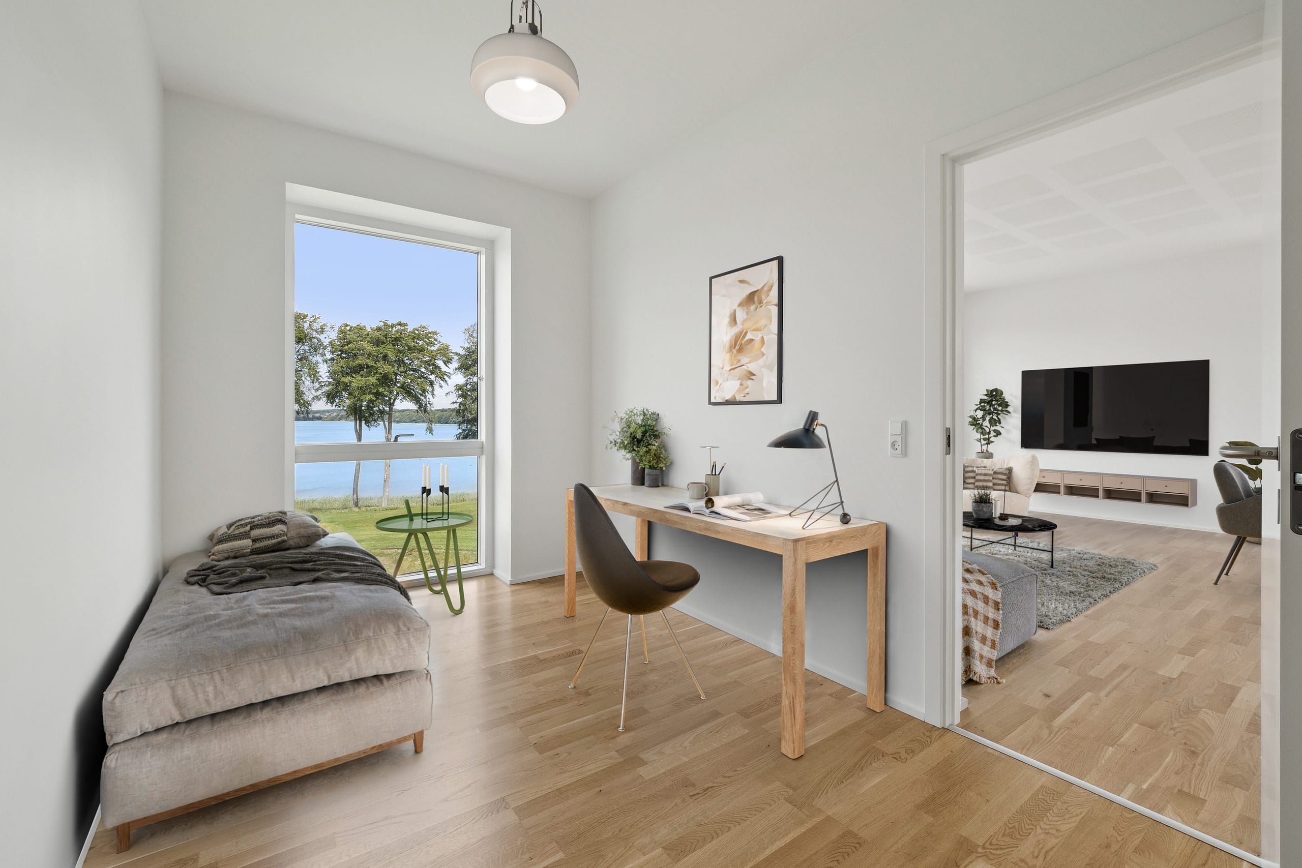 I hver af de tre punkthuse er der 11 lejligheder. Nærværende lejlighed er beliggende på anden sal. Lejligheden er 107 m2 og bl.a. indrettet med 2 værelser. Dertil kommer et badeværelse, samt et skønt rum med køkken og stue i et, og en fantastisk udsigt over Søndersø.
