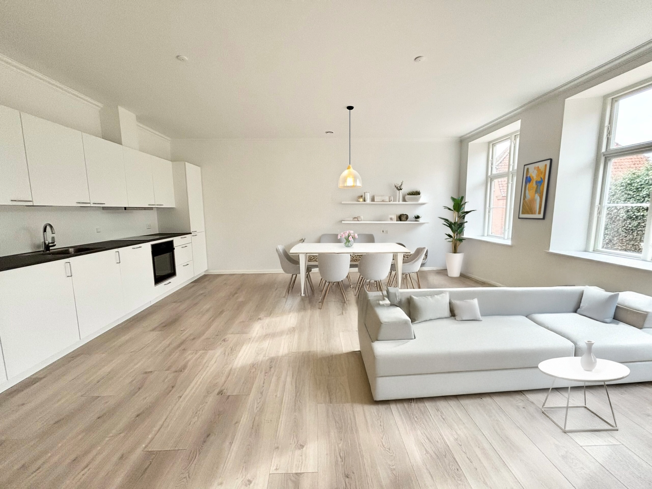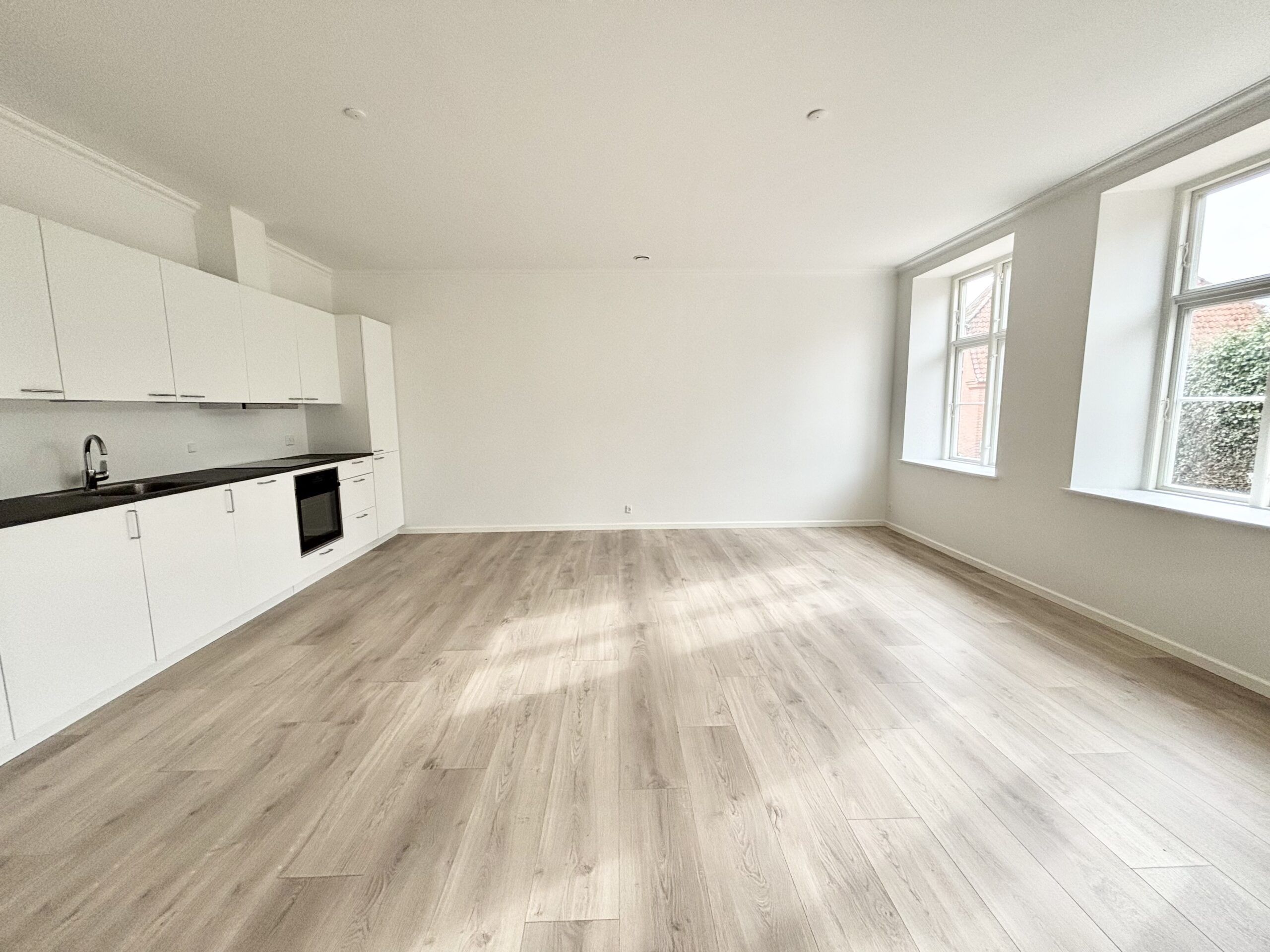 Denne velindrettede 2-værelses lejlighed på 61 m² er et oplagt valg for dig, der ønsker et lyst, praktisk og overskueligt hjem med en moderne planløsning og et godt flow mellem rummene. Lejligheden åbner ind til en lys og åben stue, der ligger i forlængelse af køkkenet og skaber et indbydende opholdsrum med plads til både spisebord og sofa. De store vinduespartier giver et flot lysindfald og gør rummet behageligt at opholde sig i dagen igennem. Det stilrene køkken er placeret langs væggen og giver god arbejdsplads, integreret opvaskemaskine og smarte opbevaringsløsninger – perfekt til både hverdagsmad og gæster. Soveværelset ligger roligt placeret i lejlighedens nordlige del og har en praktisk form, der gør det let at indrette med seng, skabe og eventuelt et lille arbejdsbord. Badeværelset er funktionelt indrettet med bruseniche, vaskesøjle og god plads til det daglige brug. En fordelingsgang binder rummene godt sammen og giver en naturlig opdeling mellem opholdsrum og soveafdeling. En moderne og overskuelig lejlighed, perfekt til singlen, parret eller som førstegangsbolig.