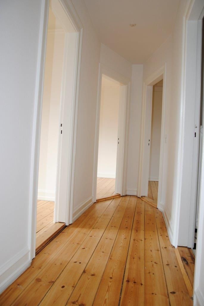 Indgang til lys entré, hvorfra der fordeles til hhv. bad og værelse på venstre hånd og stue til højre. Ligefrem har man et flot og lyst køkken med adgang til altan.