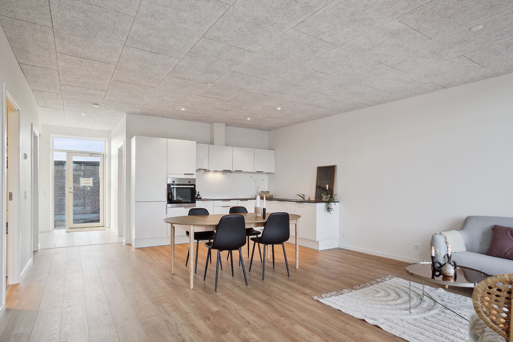 I rækkehusene i ét plan får du en entré, stort køkken/alrum med direkte udgang til den flisebelagte terrasse samt lille have. Et rummeligt badeværelse med vaskesøljen samt tre separate værelser.