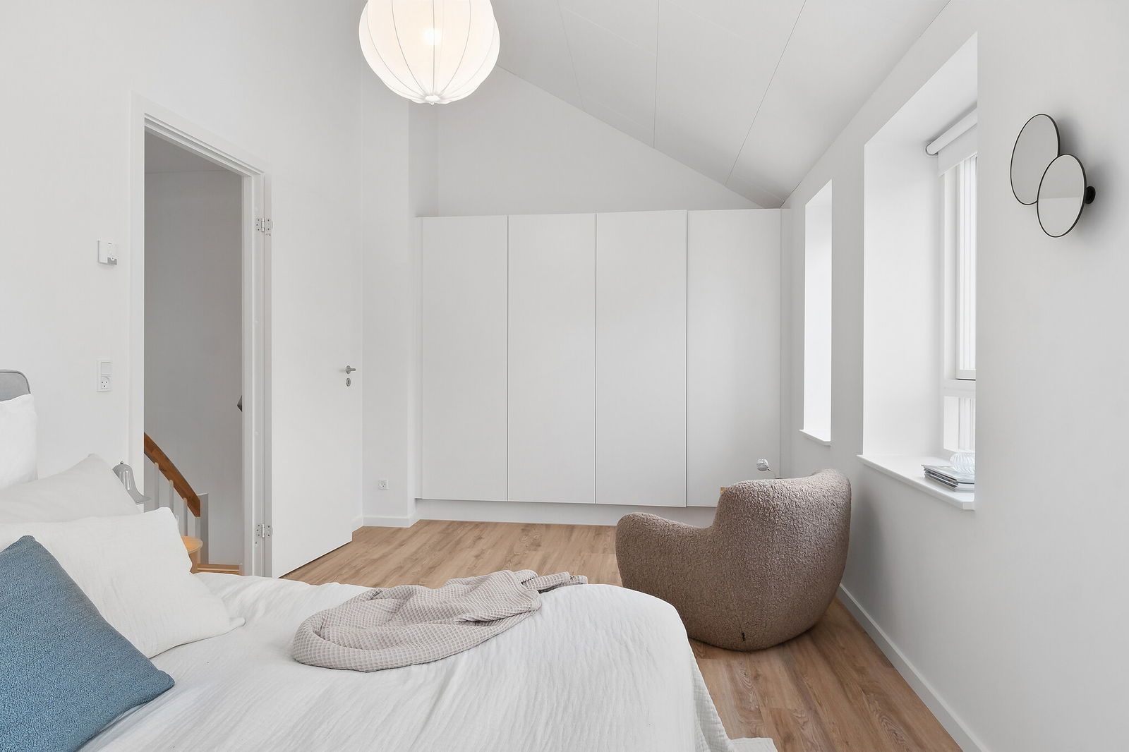 På første sal oplever du en skøn fordeling af værelser: et stort soveværelse og to gode ekstra værelser. Der er to badeværelser i huset, begge med bruser, og i stueetagens badeværelse finder du en praktisk vaskesøjle. Fra stuen er der udsigt til din egen private terrasse på havesiden – den ideelle setting til afslapning og udendørs samvær.