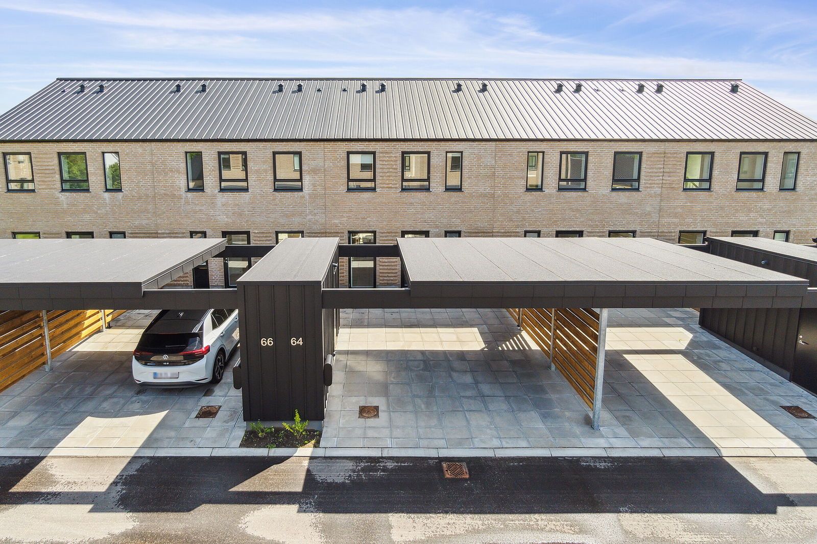 Foran boligen er der yderligere en terrasse, samt en overdækket carport med plads til to biler og mulighed for el-ladestander. Et redskabsrum sørger for opbevaringen af diverse haveartikler.