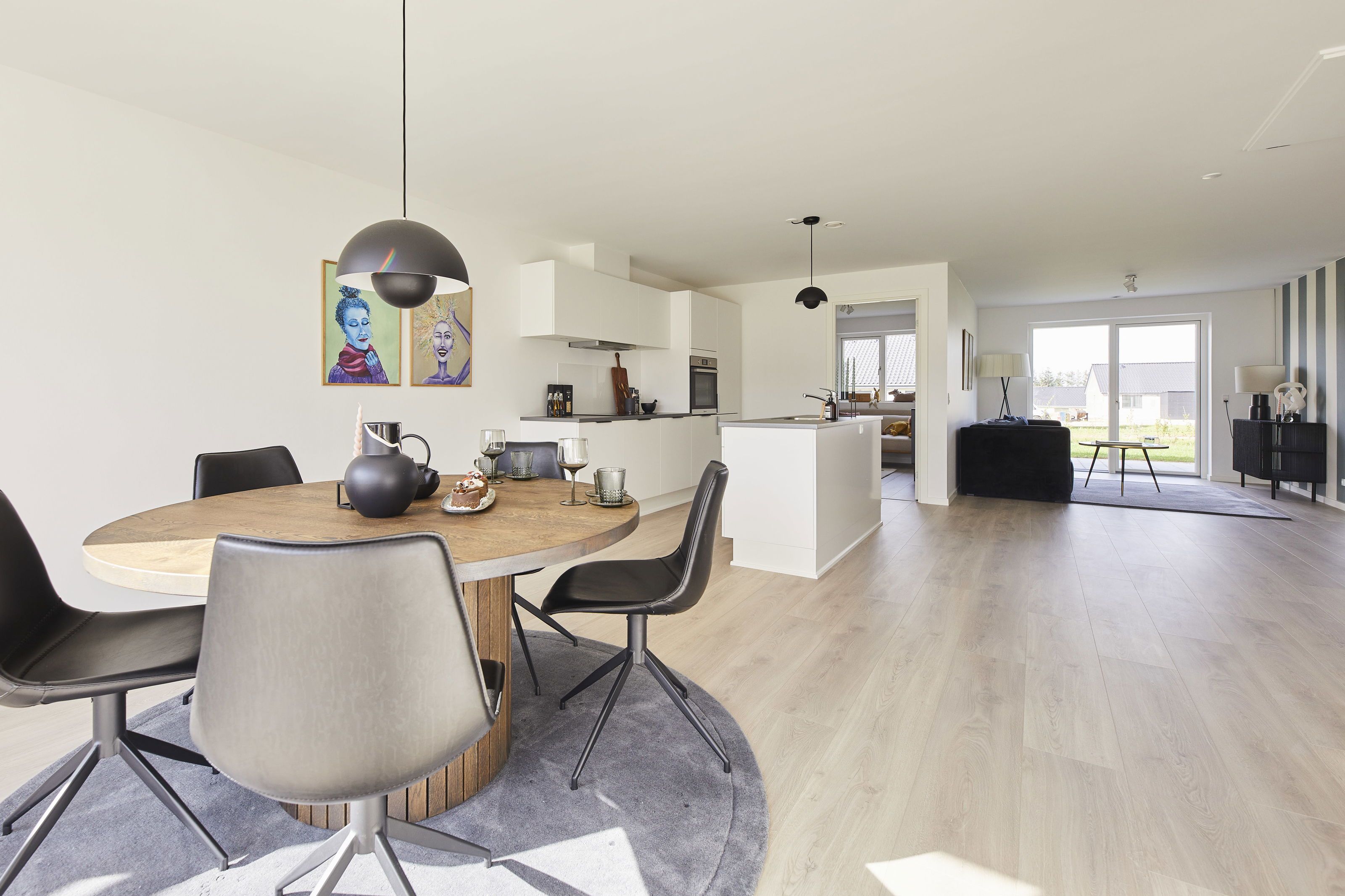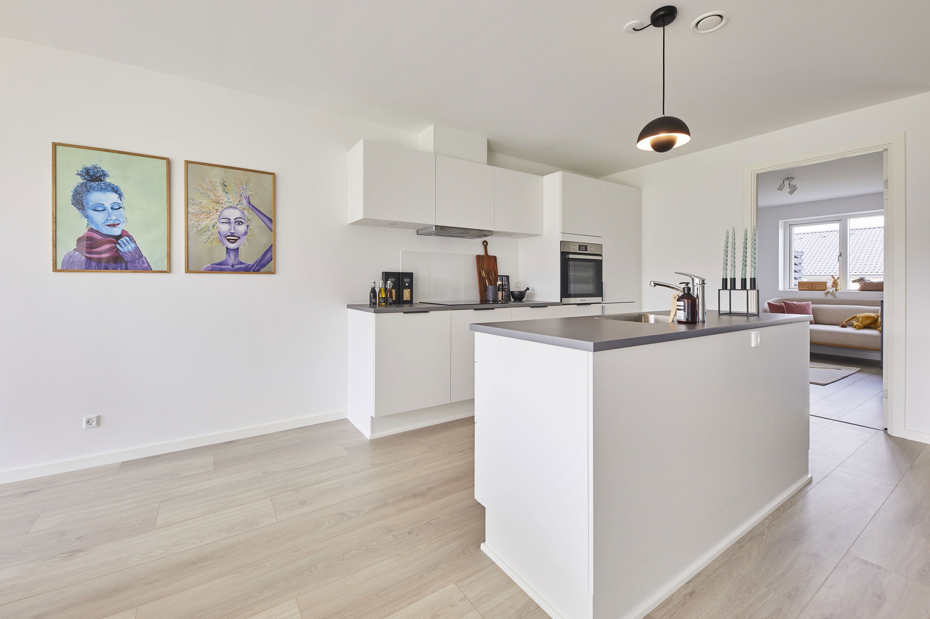 ### Velkommen til pigernes kvarter i Give. Her ligger et indbydende 4-værelses dobbelthus på 115 m², hvor dagslyset finder vej ind fra flere sider, og hverdagen får de bedste rammer. Allerede ved indkørslen mærker man roen: to p-pladser ved døren og et lille redskabsrum til cykler og havesager. **Velkommen hjem** Entréen samler hverdagens ting, før man træder ind i boligens store køkken/alrum/stue. Rummet er hjemmets naturlige samlingspunkt med køkkenø, gode arbejdsflader og plads til både langbord og et blødt sofahjørne. De brede vinduer binder ude og inde sammen, så måltider og hygge let flytter ud, når vejret kalder. **Privat og praktisk** I den rolige ende ligger soveværelset med skabsvæg, og dertil to ekstra værelser, der kan bruges til børn, kontor eller gæster. Bryggerset ligger smart mellem entré og opholdsrum med vask, plads til vaskemaskine og tørretumbler samt opbevaring. Badeværelset er moderne med bruseniche og væghængt toilet. **Materialer og komfort** Overfladerne er lyse og gennemførte, med egeplank i opholdsrum og værelser og mørke klinker i entré, bryggers og bad. Gulvvarme i alle rum og balanceret ventilation skaber et behageligt indeklima året rundt, og opvarmningen sker via fjernvarme. I køkken, bad, bryggers og soveværelse er der stilrene HTH-moduler og praktiske laminatbordplader. Alle hårde hvidevarer følger med – også vaskemaskine og kondenstørretumbler. **Udeliv** Terrassen ligger i naturlig forlængelse af stuen, så haven bliver en del af hverdagsscenen – plads til grill, plantekasser og leg på græsset. Udvendig stikkontakt og vandhane gør udelivet nemt, og der er forberedt tomrør til elbillader i indkørslen. **Fællesskab og aktivitetshus** I Pigernes Kvarter er fællesskabet en naturlig del af hverdagen. Det moderne aktivitetshus danner ramme om sociale aktiviteter som madklub, banko og børneaktiviteter og kan også lånes til private arrangementer. Huset rummer desuden to gæsteværelser med eget bad og toilet. Via en fælles app kan du nemt booke faciliteter, følge med i aktiviteter og holde kontakten til naboerne. > **Praktisk info** > > * To p-pladser ved boligen > > * Alle hvidevarer inkl. vaskemaskine og tørretumbler > > * Gulvvarme i hele huset, ventilation og fjernvarme > > * Individuelle forbrugsmålere; forbrug afregnes direkte til forsyningsselskaberne > > * Forberedt til elbil-ladestander (tomrør) > > _Der tages forbehold for mindre ændringer og rettelser._