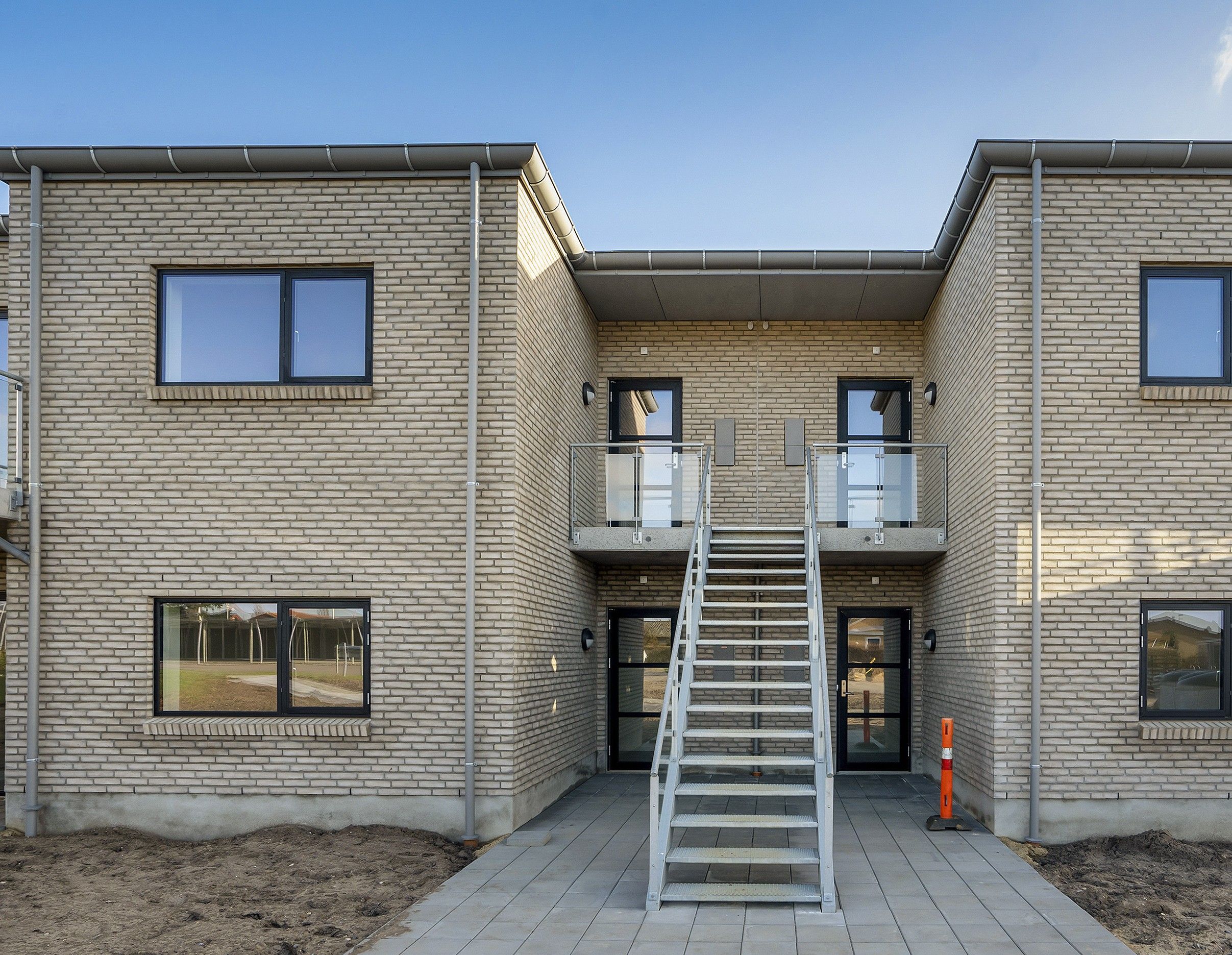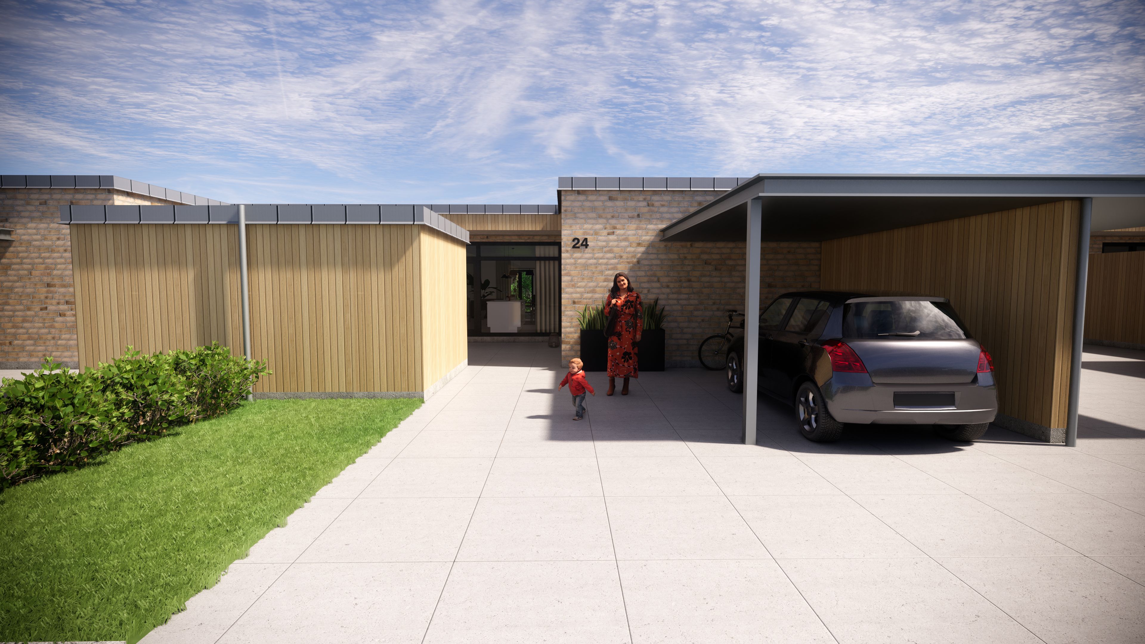 Der er carport og depotrum til hver bolig, hvor der samtidigt er forberedt til el lade bokse i carporte. I materialer er der tænkt både levetid, Co2 påvirkning og vedligehold. Byggeriet er udvendigt udført i en balance mellem tegl, træ og alu. Med denne sammensætning reduceres Co2 udledningen,men samtidig opretholdes en lang levetid, et minimum af vedligehold og materialer, der alle er genanvendelige.