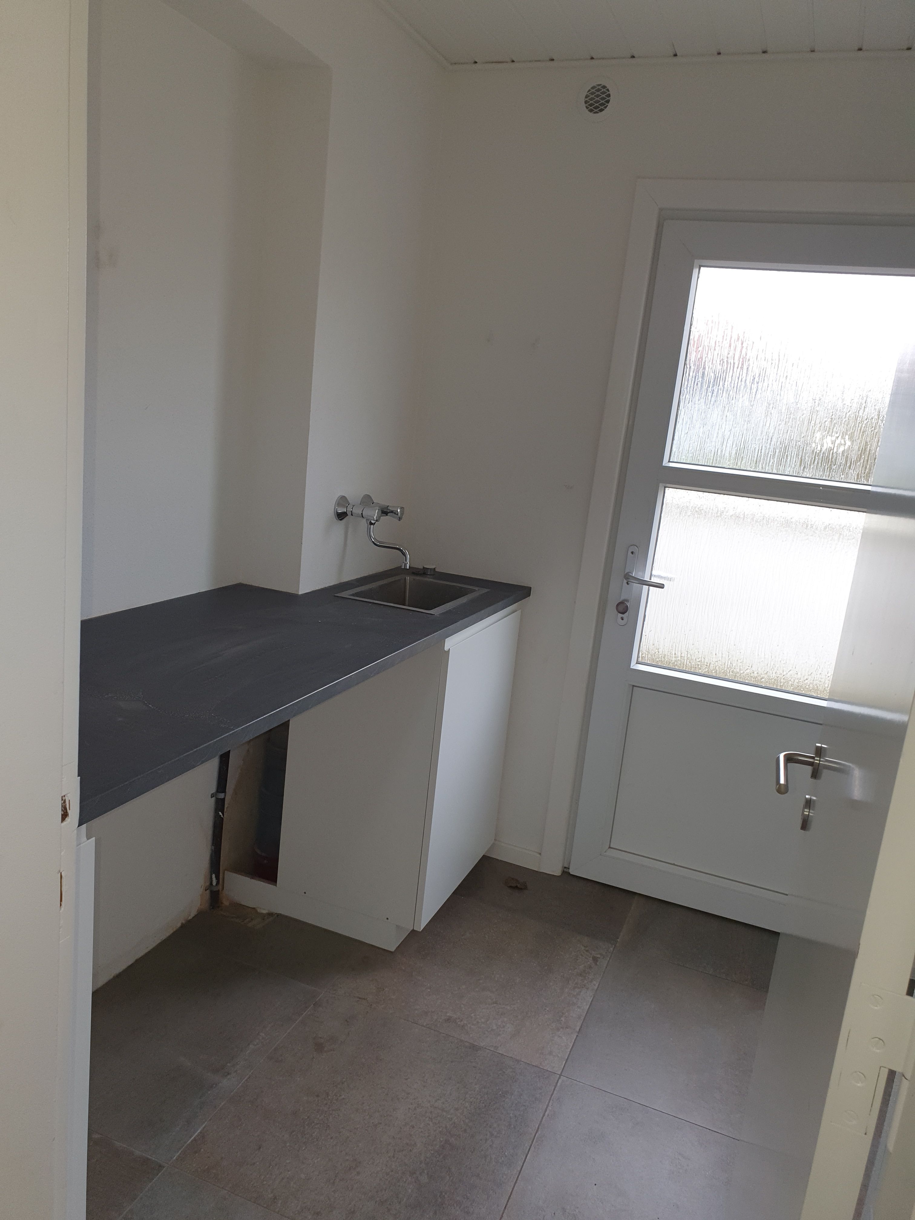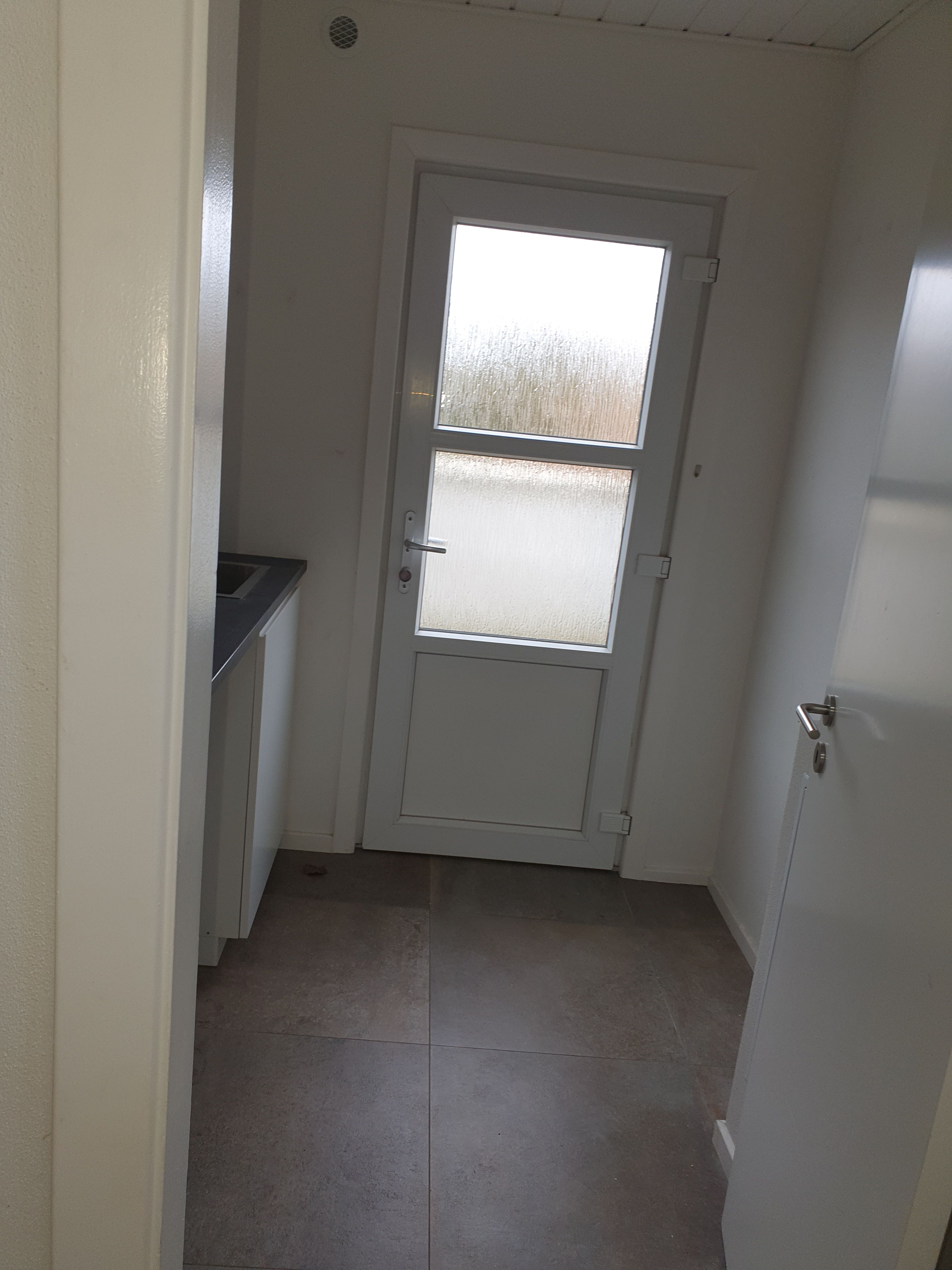 På badeværelse er der lyse fliser, samt gulvvarme. Der er afsat plads til vaskemaskine mm.