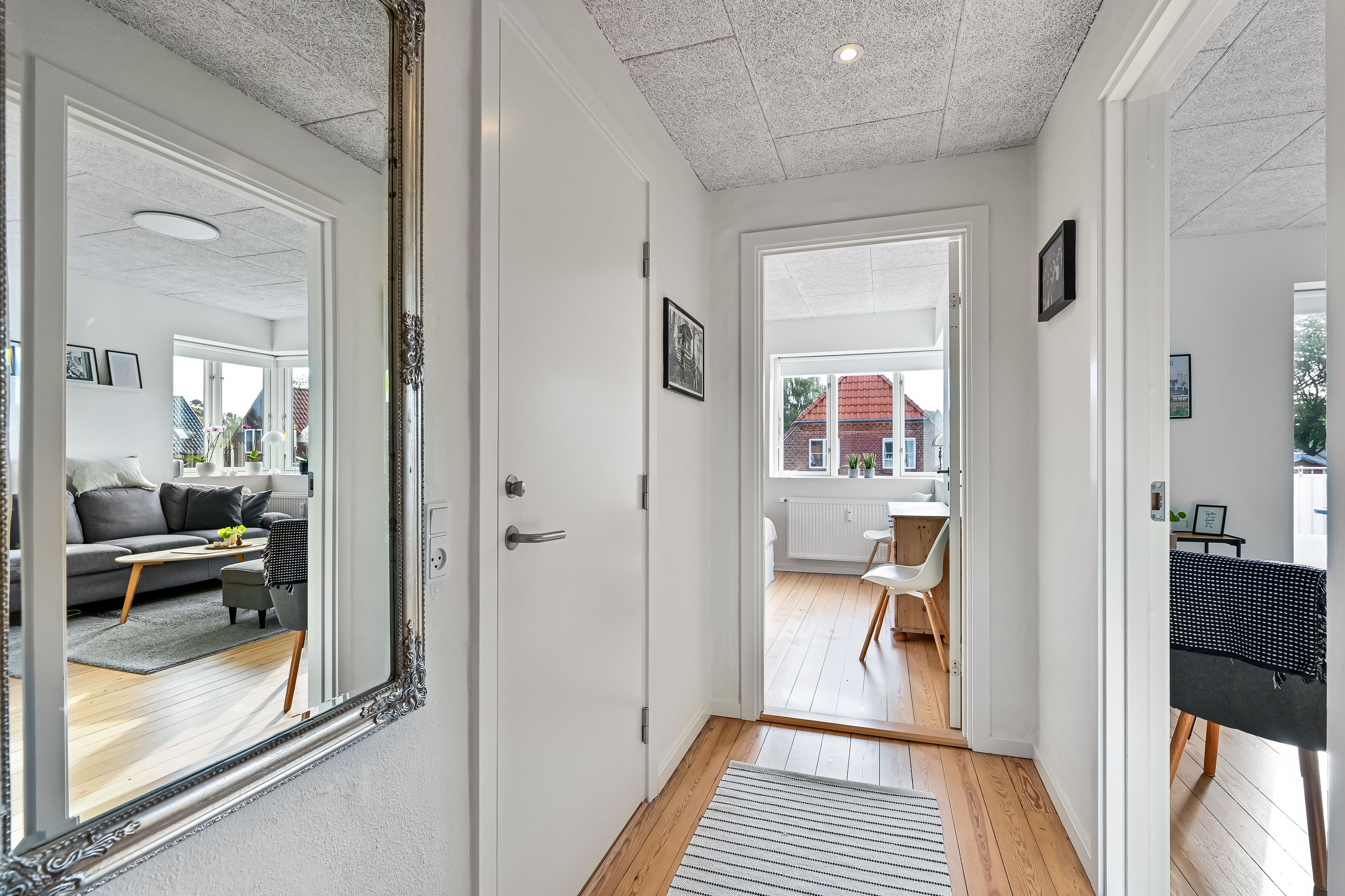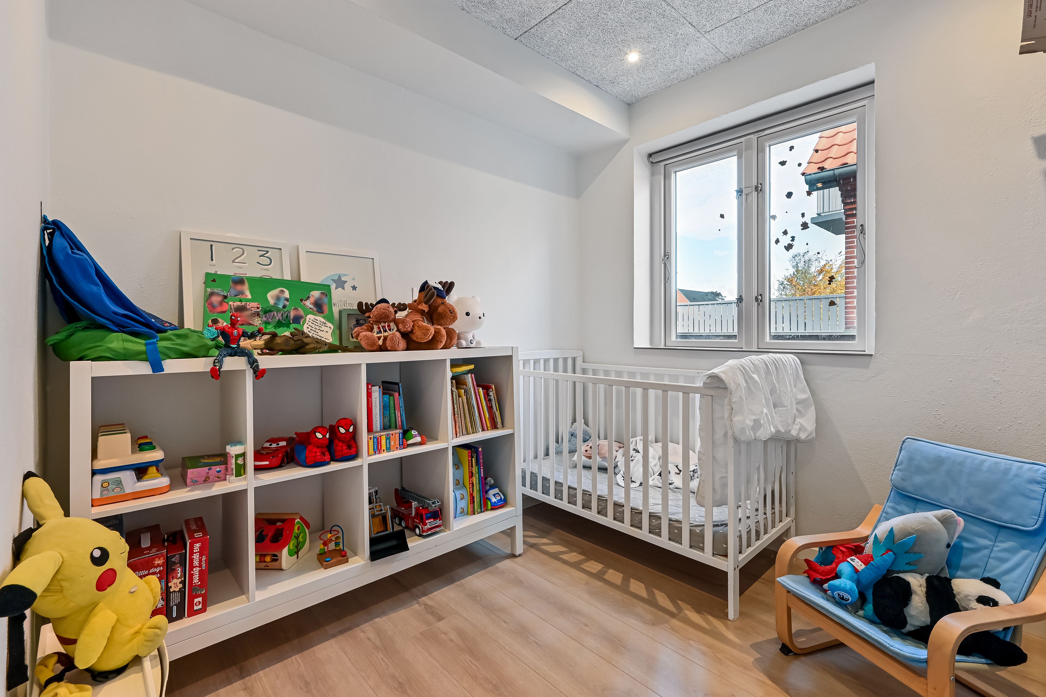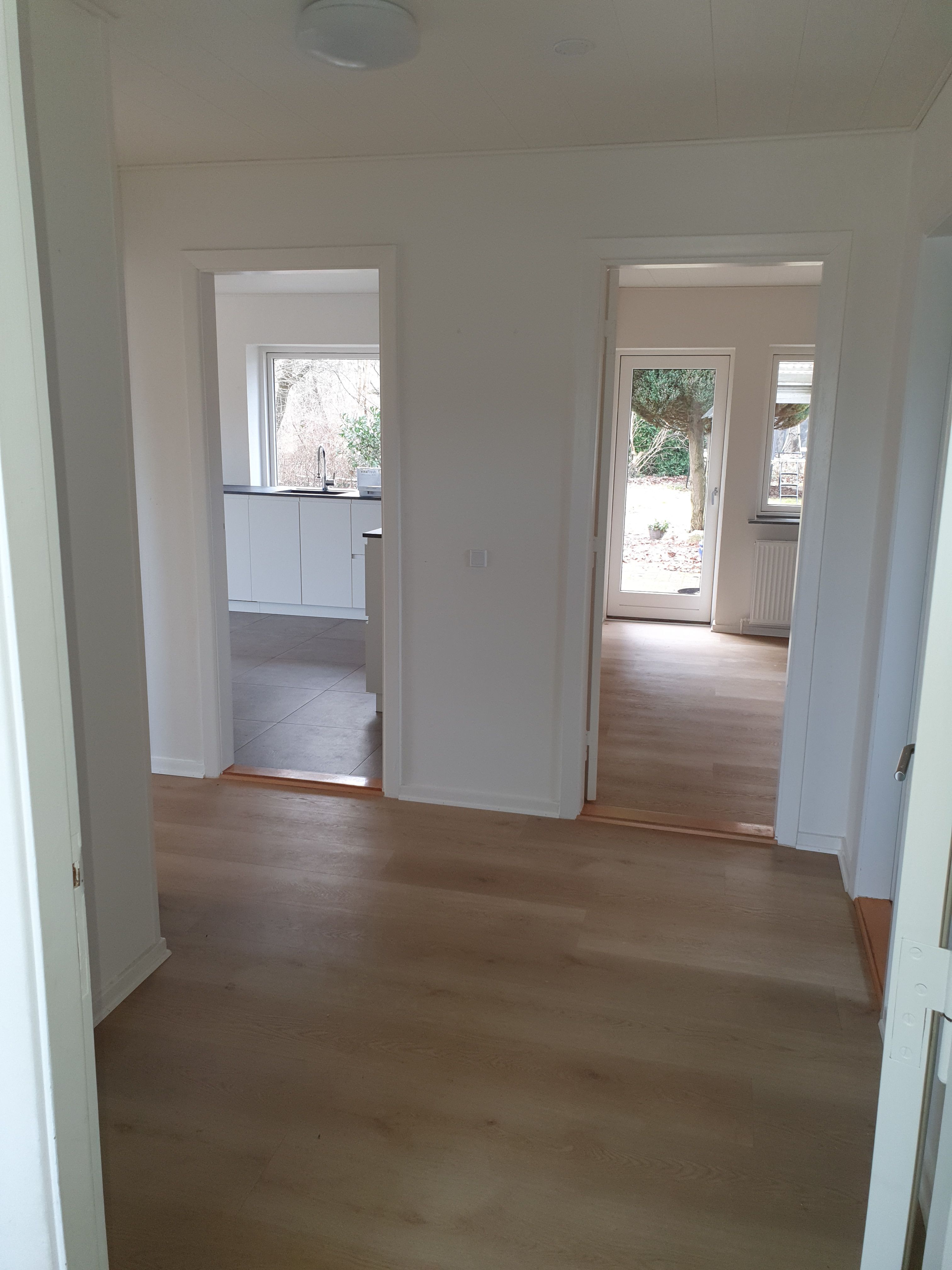 Der er lyse trægulve i stue og værelser, med gulvvarme overalt.