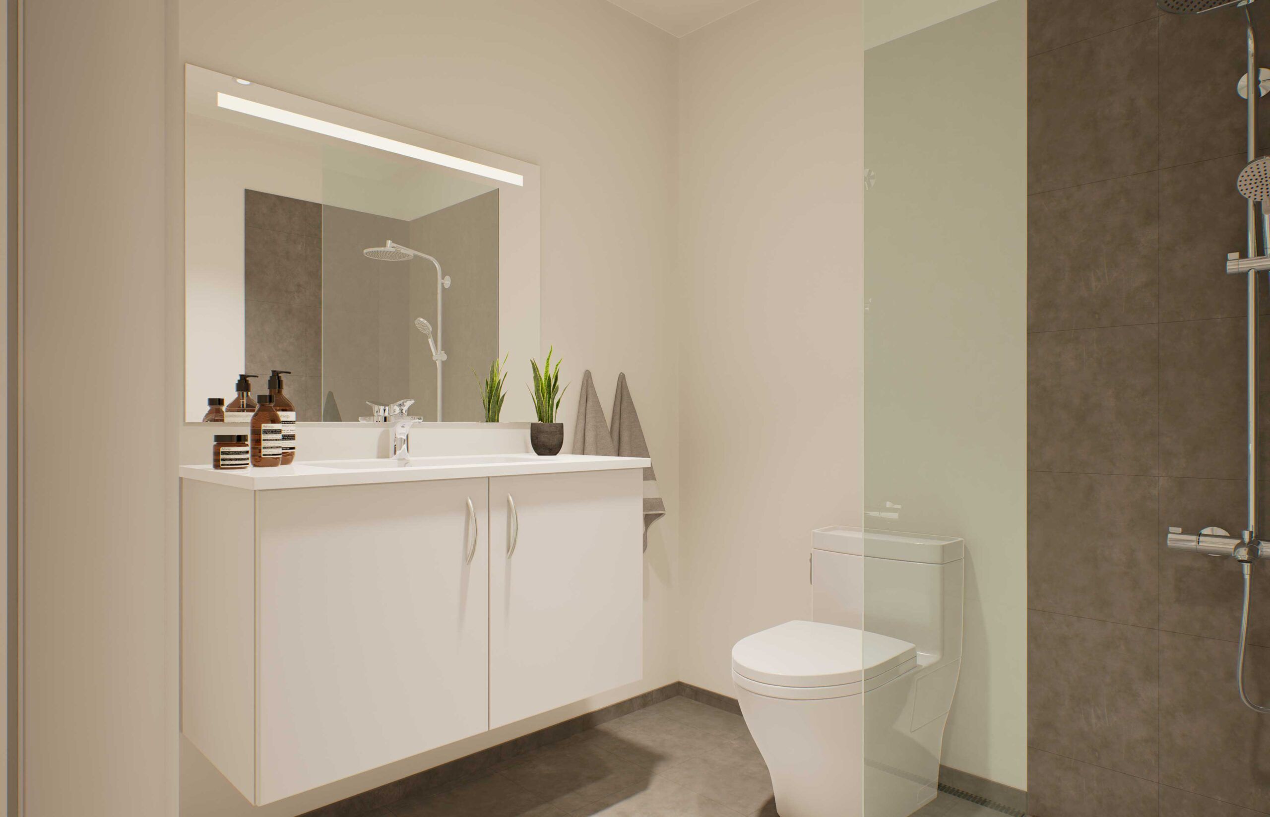 stort badeværelse også med gulvarme og plads til egen vaskemaskine og tørretumbler.