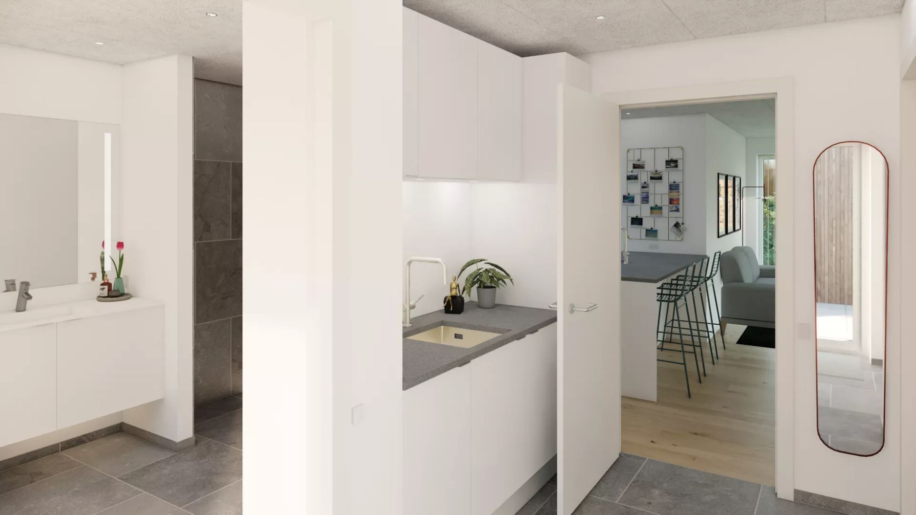 Indenfor træder du ind i en lys entré, hvorfra der er adgang til boligens badeværelse i stueplan. Herfra fortsætter du direkte ind i boligens naturlige samlingspunkt – det åbne køkken-alrum og stue.