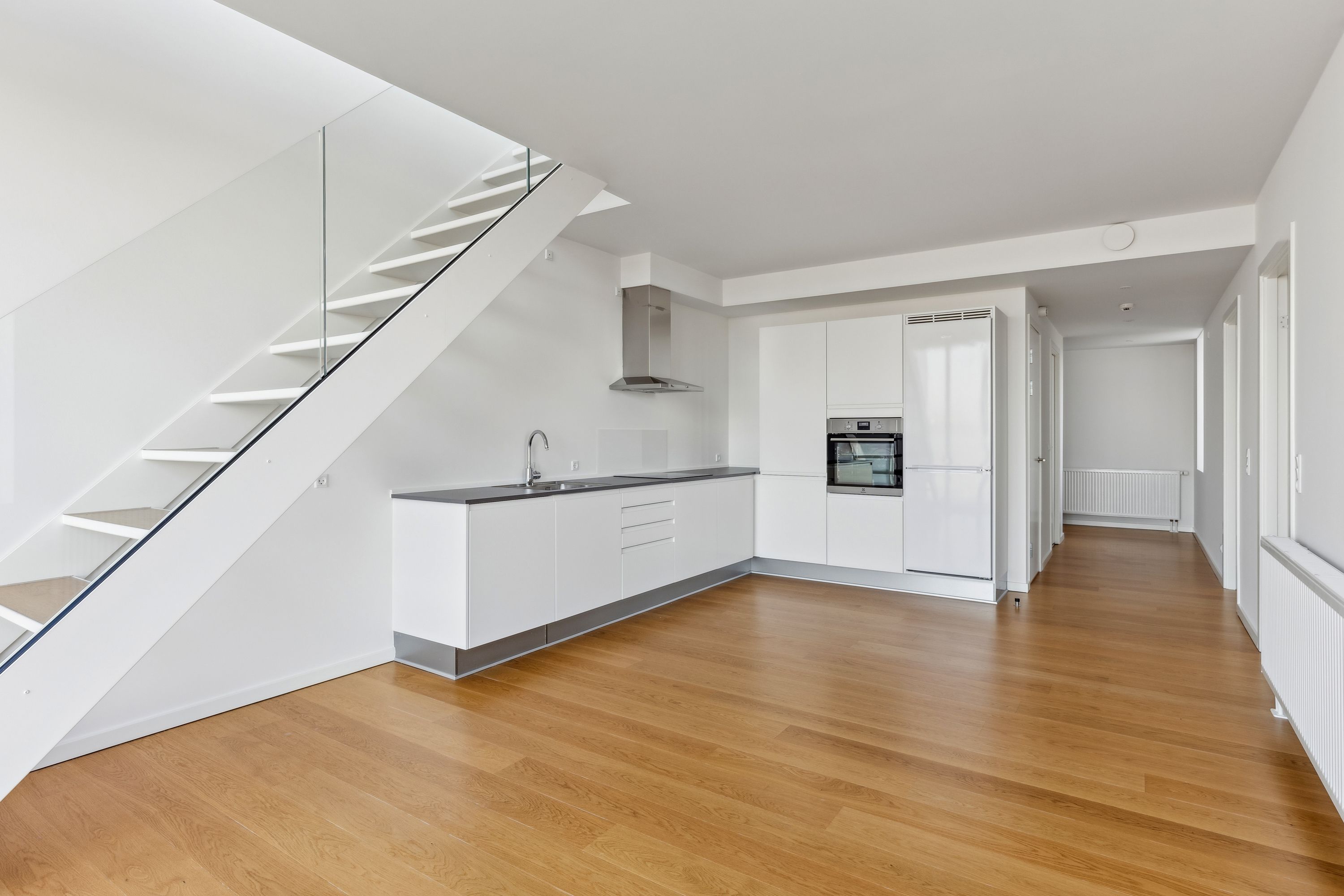 Entréen byder på en rummelig ankomst med plads til opbevaring af jakker og sko. Vaskemaskine og tørretumbler er allerede installeret i boligen.