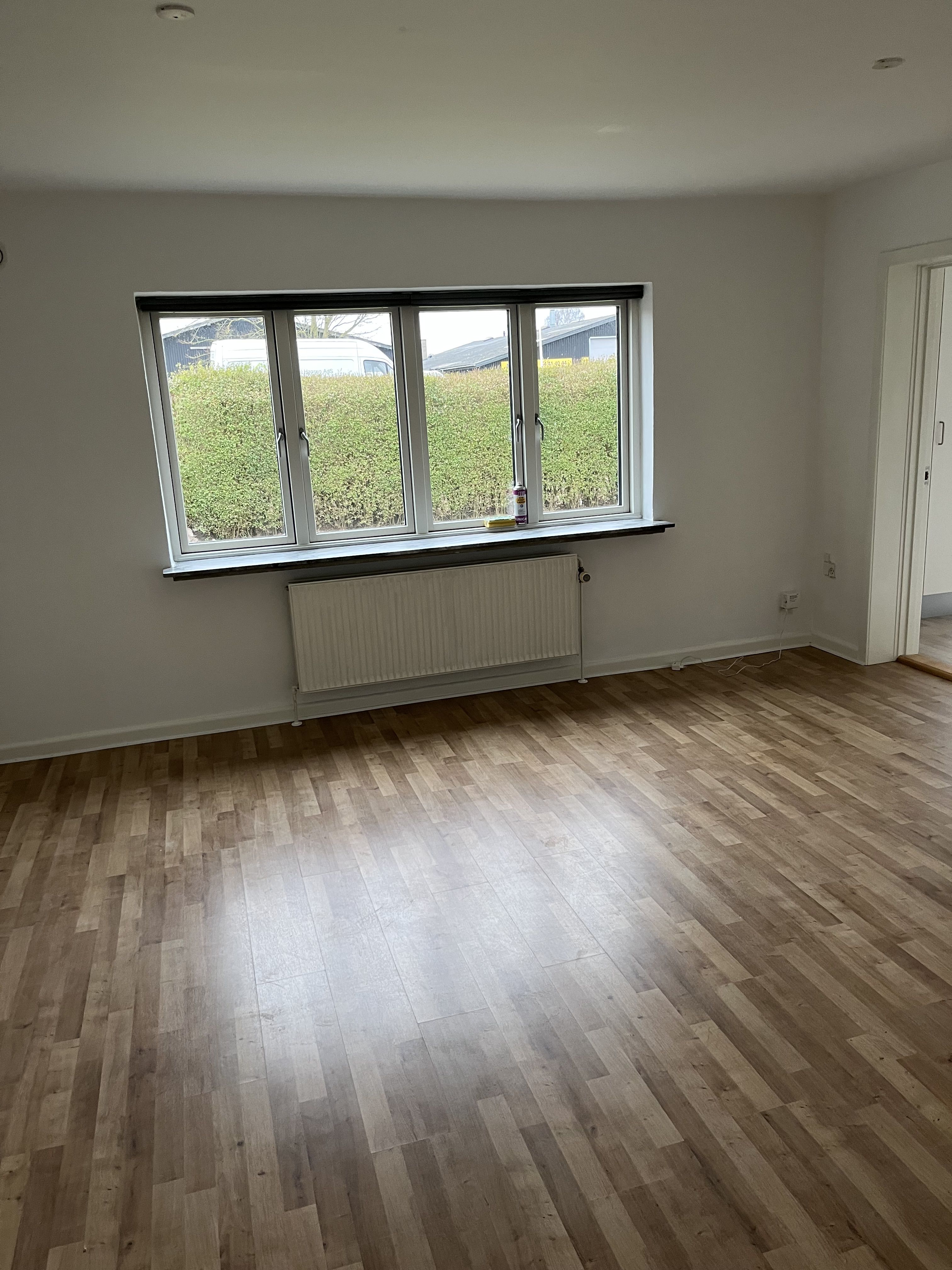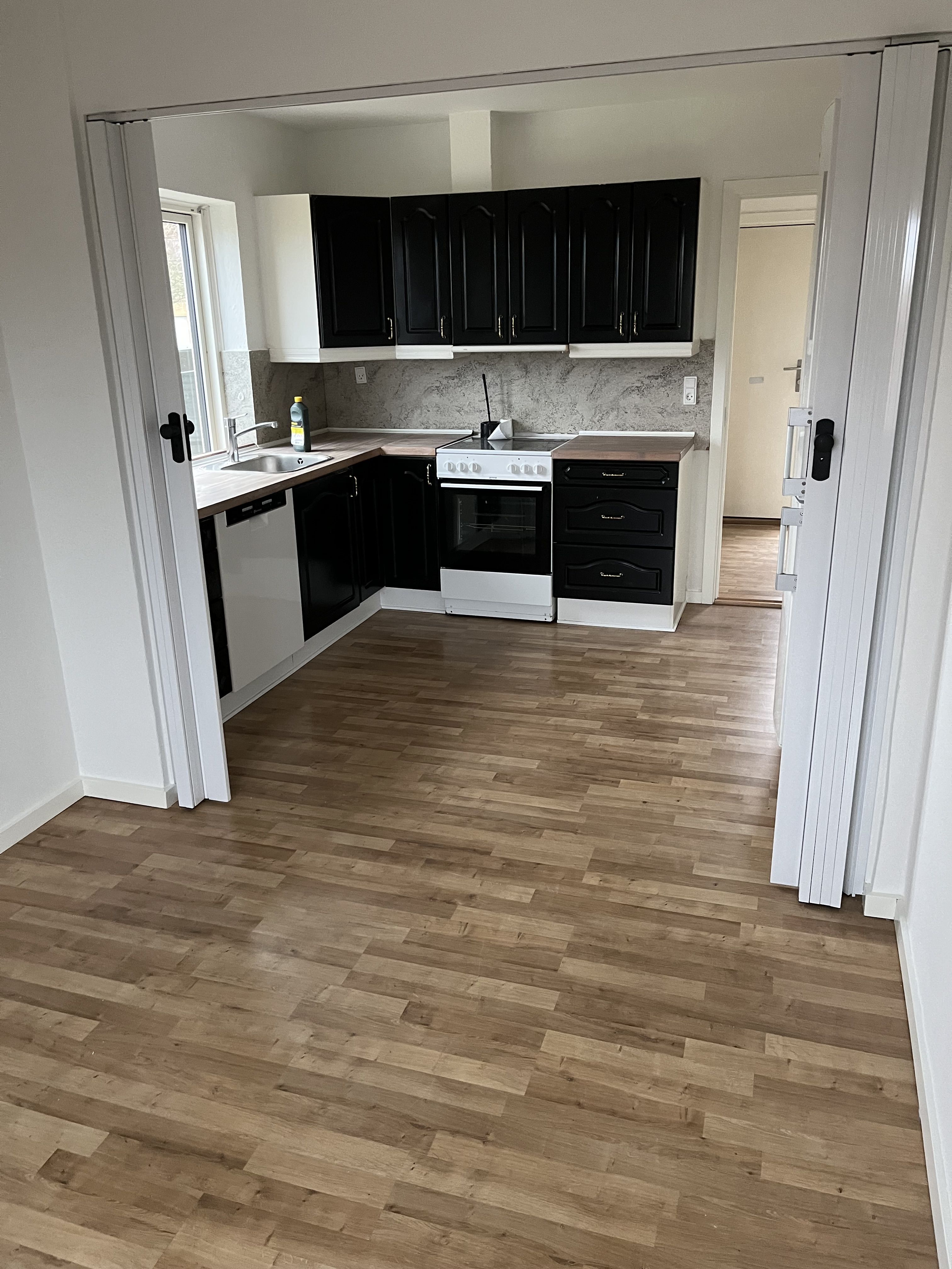 Fra boligens lyse entre er der adgang til et rummeligt badeværelse med vaskemaskine samt 1 stort værelse med faste skabe. For enden af entréen åbner rummet sig op i stue, alrum og køkken ud i ét, hvorfra der er adgang til stort soveværelse med faste skabe.