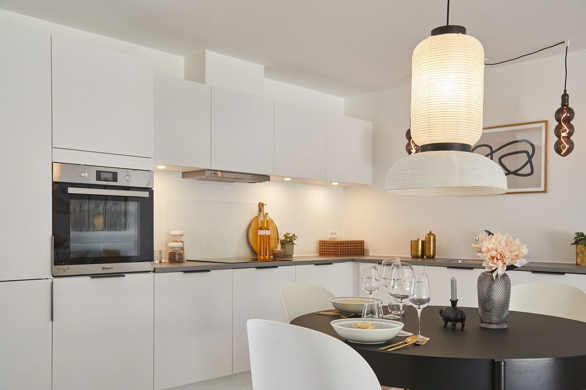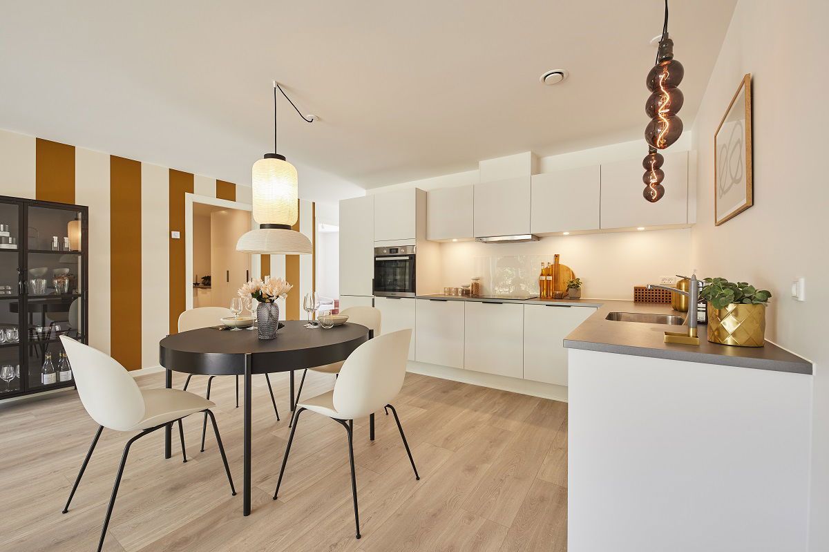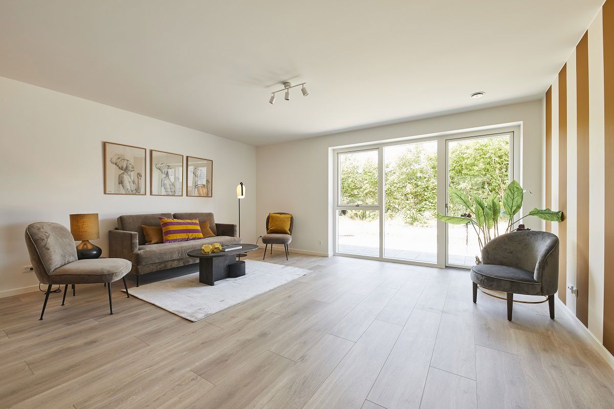 Moderne rækkehus hvor alle kvadratmeter er udnyttet til fulde. Man træder ind i særskilt entre med videre adgang til et værelse. Fra entreen går man ind i husets alrum med et moderne køkken i åben forbindelse til stue med gode muligheder for indretning af et hyggeligt sofahjørne. Fra alrummet finder man særskilt bryggers med vask samt vaskemaskine og tørretumbler, herfra finder man et stort moderne badeværelse. Ydermere er der et stort soveværelse med indbygget skabsvæg. Fra stue er der direkte udgang til den bagvedliggende terrasse samt dejlig have. Have: Egen have og terrasse Udhuse: Redskabsrum 7m² Parkering: 2 p-pladser ved boligen Al forbrug afregnes direkte til forsyningsselskaberne **Åbne og lyse huse** Alle husene er indrettet lyse og venlige med hvide, glatte lofter og vægge. Store, oplukkelige vinduer for ekstra godt lysindfald overalt. Opholdsrum (køkken/alrum/stue) med store vinduespartier på flere sider for maksimalt lysindfald. Gulve af egeplank (laminat) i køkken/alrum, stue og værelser. Entré, bryggers, badeværelse og brus udført med lækre klinkegulve i lys grå. Alle døre i glat, hvid finish med rustfri stålgreb og uden dørtrin for optimal adgang. Murede vindueskarme og vandskuret i hvid. Vægge mod gulv afsluttet med hvide, glatte fodpaneler. **Fine detaljer overalt** Alle boliger er med bryggers med bordplade og vask. Boligens badeværelse ligger i forbindelse med bryggerset. Køkken, bad, bryggers og soveværelse har moderne moduler i glat, hvid afslutning og med linjegreb i farven antracitgrå. Bordplader i praktisk laminat i farven ’rustik skifer’ med rummelige stålvaske. Stænkplade bag kogepladen for nem rengøring. Vask i badeværelse af formstøbt materiale. Væghængt toilet fra Ifö Sign, kvalitetsarmaturer fra tyske Hans Grohe og linjeafløb i bruseniche. **Kvalitetshvidevarer** Alle hvidevarer medfølger i anerkendt kvalitet, herunder integreret køl/frys, integreret opvaskemaskine, kogeplade med induktionsteknologi, emhætte og indbygningsovn i højden med pyrolyse-teknologi. Der medfølger ligeledes vaskemaskine og tørretumbler placeret i bryggers. **Fast og god belysning** Der er etableret lyskilde i bad og bryggers samt ved ventilation på loft. I køkken er der spot i overskabene. **Forberedt for el-bil** Der er forberedt tomrør til ladestation for el-køretøj. **Sundt indeklima og gulvvarme** Der er gulvvarme i hele huset. Dette styres via separate termostater i alle rum. Boligen er udført med ventilationsanlæg, der sikrer et sundt og godt indeklima. **Individuelle forbrugsmålere** Forbrug til varme, el, vand og spildevand afregnes direkte mellem lejer og forsyningsselskaberne. Opvarmning via fjernvarme. Udvendigt forefindes der stikkontakt og vandhane samt væglampe ved entredør.